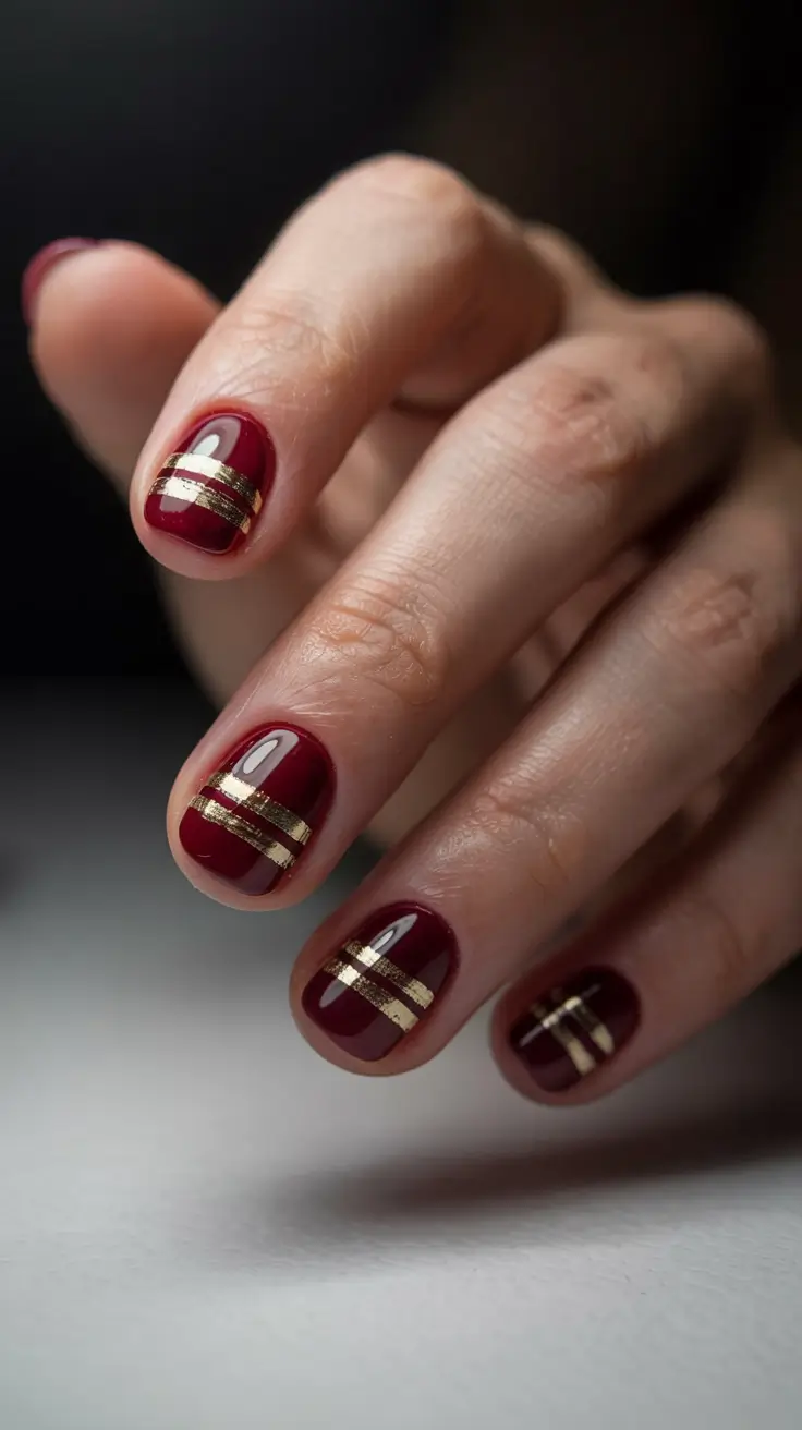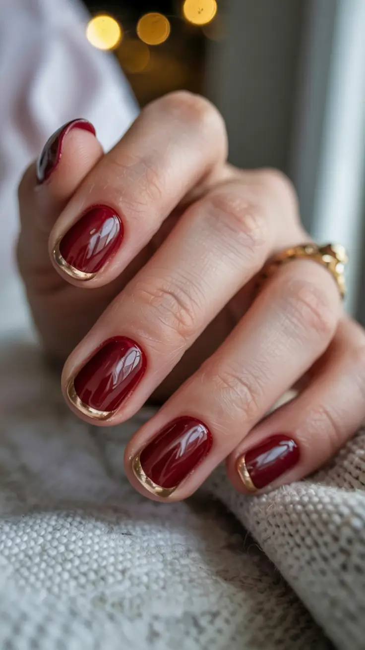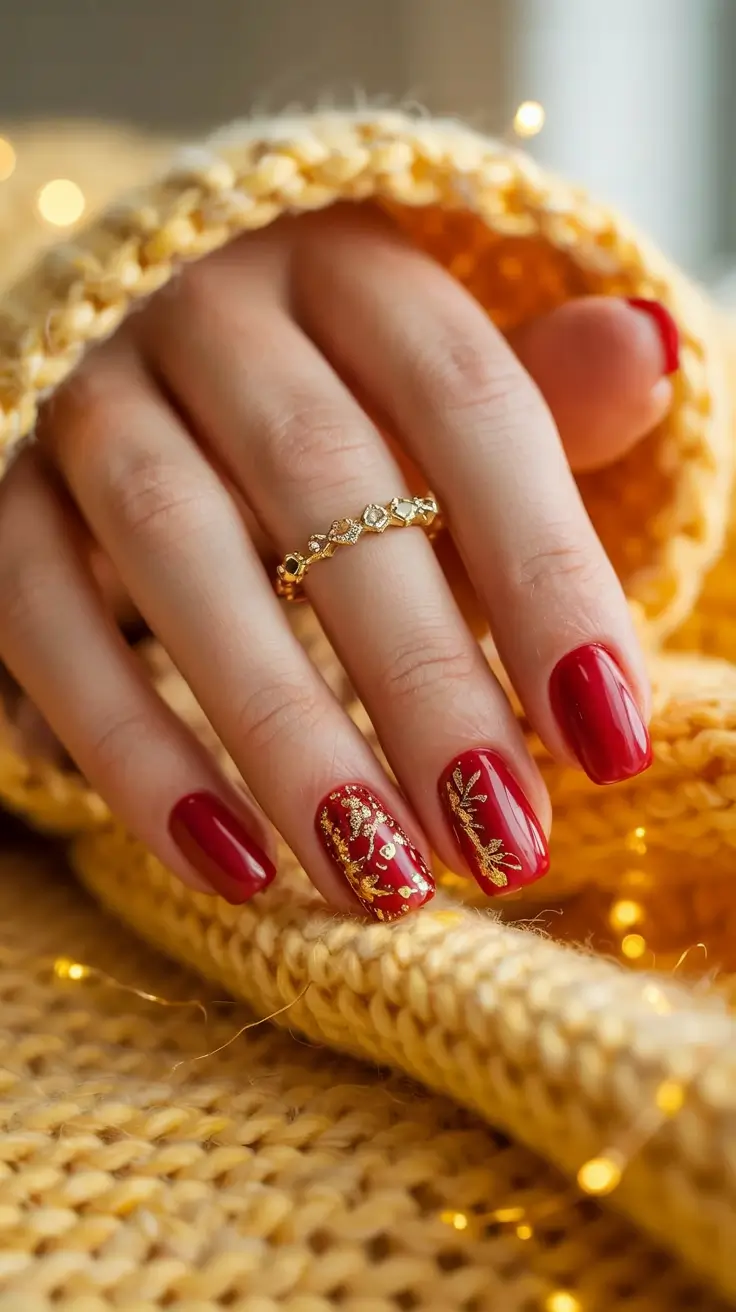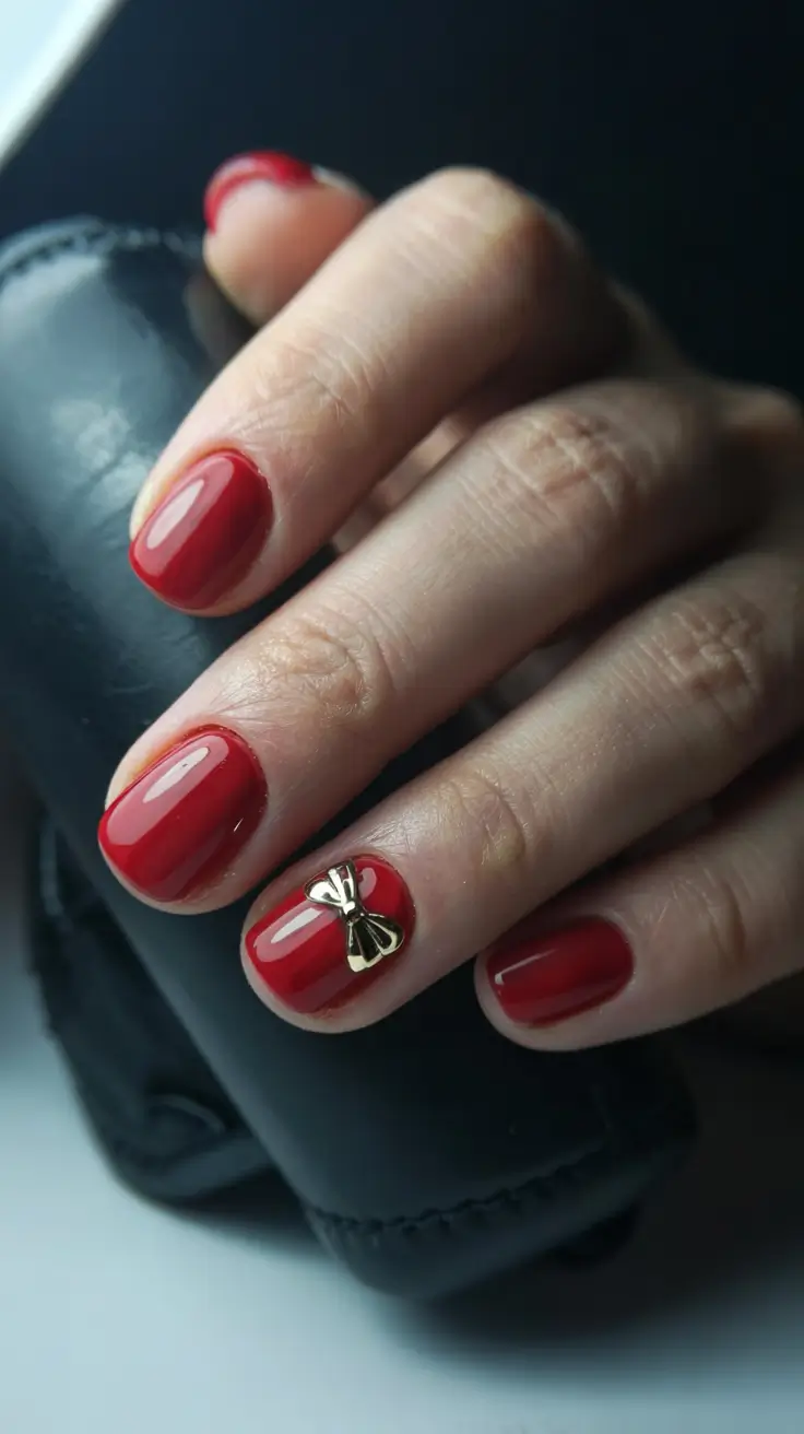 When I see this manicure, I associate it with old-Hollywood glamour red lips, a glass of champagne, and soft jazz played in the background. It is very elegant and not excessive, which once again proves that red and gold is a love story that does not grow old.