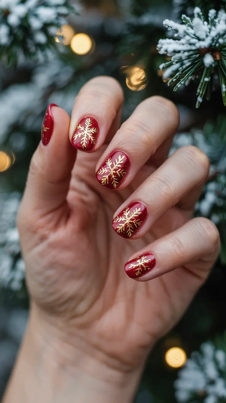 The combination of warmth and cold in red and gold is something magical in winter light. The design captures that feeling and transforms it into art, crisp white snowflakes on a dark cherry polish, with a gold-flecked accent nail to pick up all the sparkle.