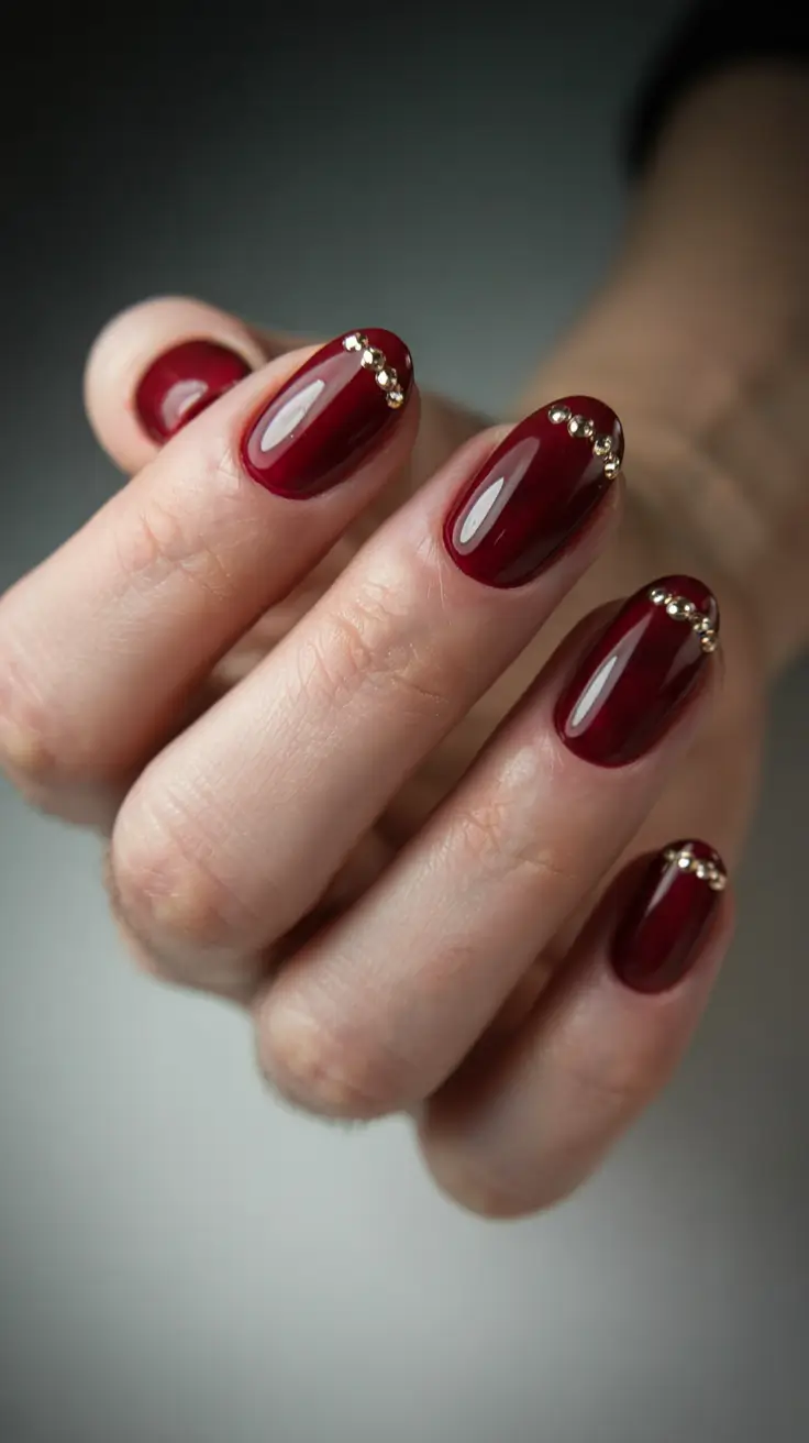 And in case your taste is more toward beautiful with a touch of drama then this design is perfection. The base is in a rich ruby red, smooth and shiners, and at the top of every nail are small gold beads, as though a row of little decorations or a gilt halo.