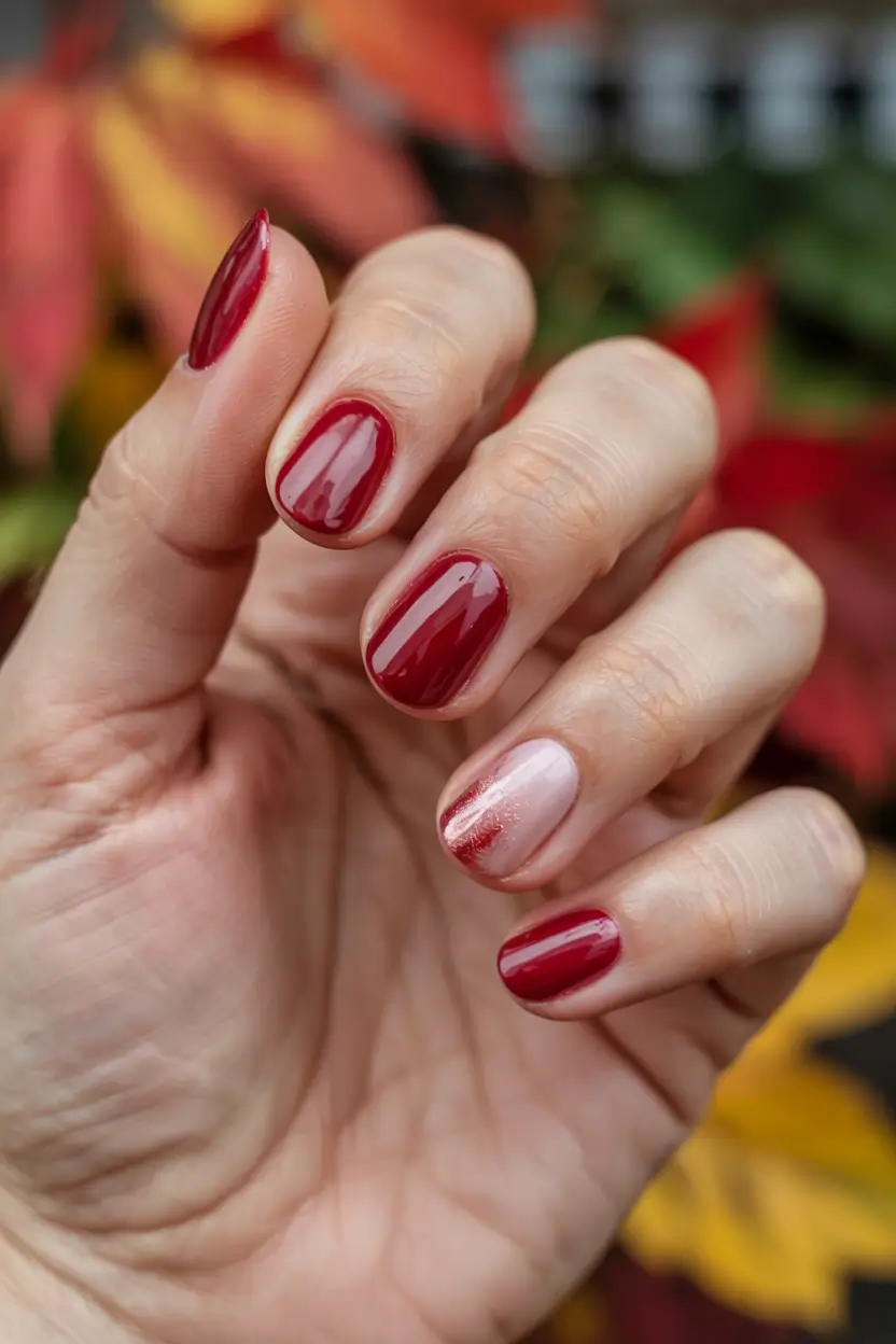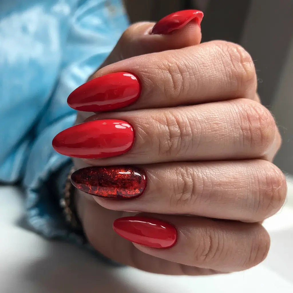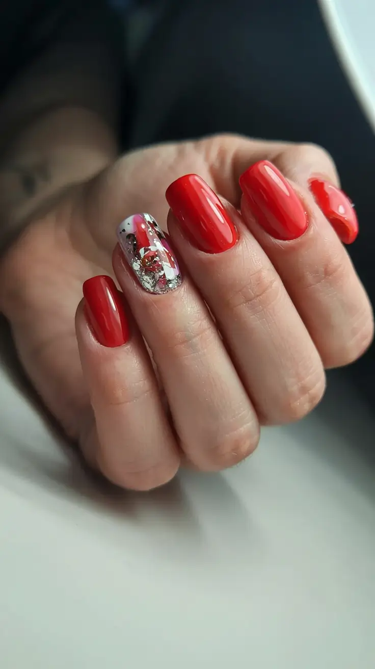 I would suggest that the base should be done in Big Apple Red by OPI and the accent should be done using metallic fragments of foil or big glitter over a clear gel background. Spray on the top of that glassy finish seal.