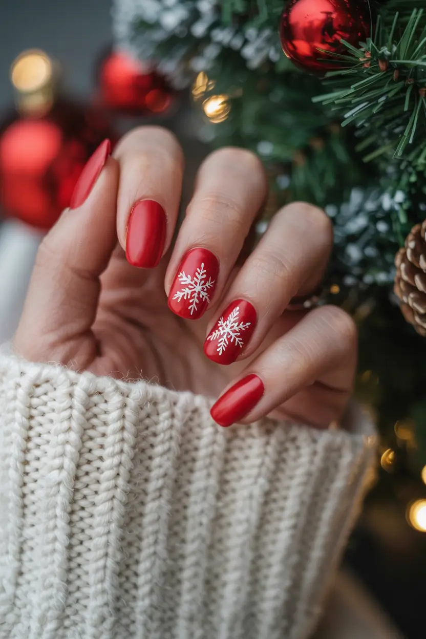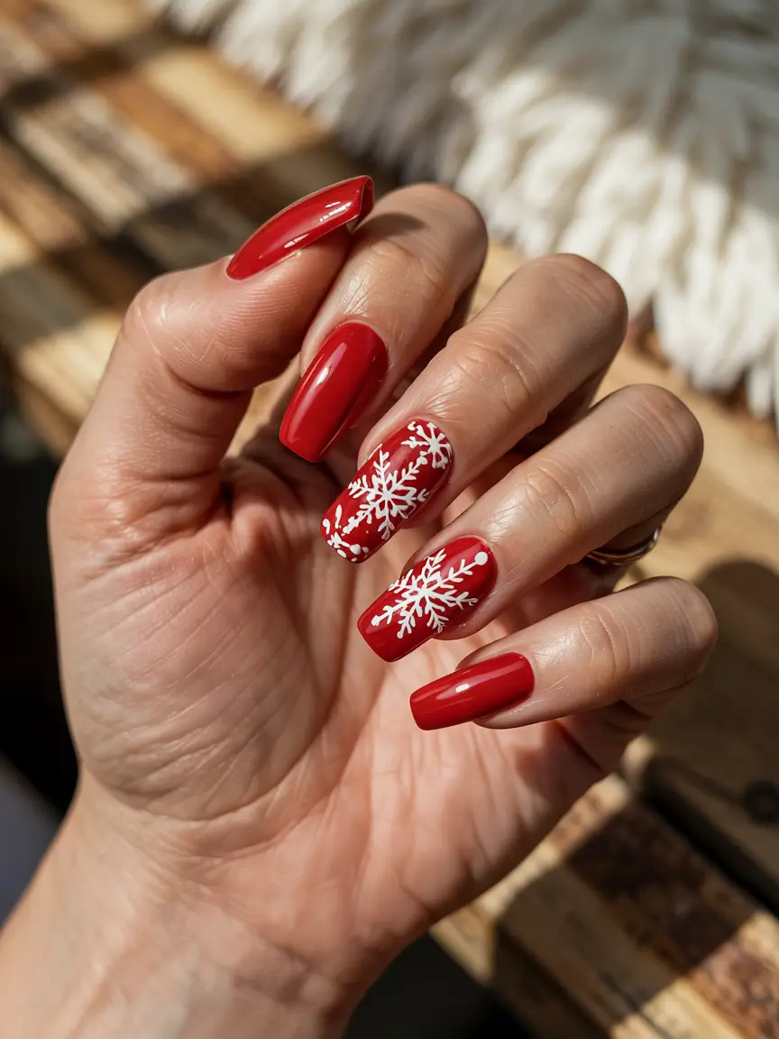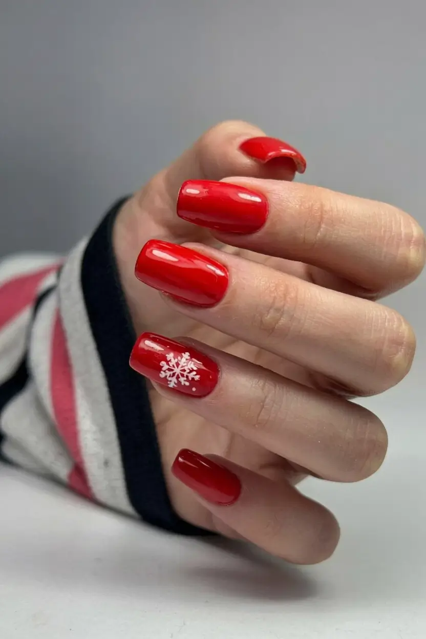 There are years when I would like to spend something grandiose. On other years, simple designs are the ones that make one feel beautiful. It is the latter, a beautiful deep, glossy red manicure, and only one white snowflake on the nail. It is elegant, celebratory, and vehemently self-confident, the ideal option to those who love red christmas nails shorts and do not want to be noticed.