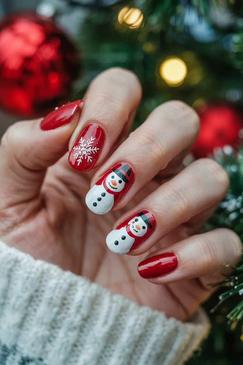 This manicure is pure happiness – a game with the holidays that does not look unpolished and fashion-outdated. Two cute snowmen, hats, scarves and little smiles are used to adorn bright red nails. It is charming, nostalgic and sure to bring out a smile in people.