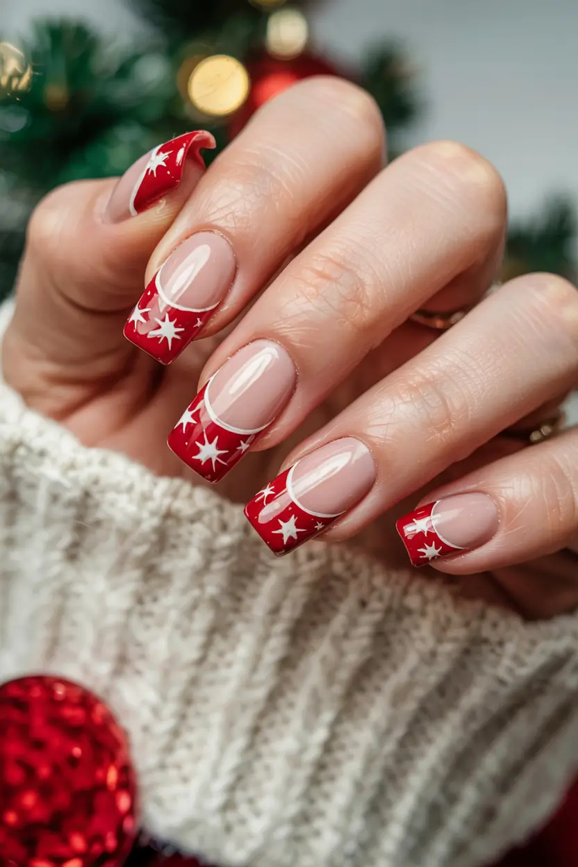 The French manicure is timelessly elegant, and it is made of Christmas magic with this holiday twist. In lieu of the standard white tip we have a bright red french manicure interspersed with tiny white stars. This foundation is a sheer, natural nude, which retains the entire appearance clean, and the red tips are full of jubilation and exultation.