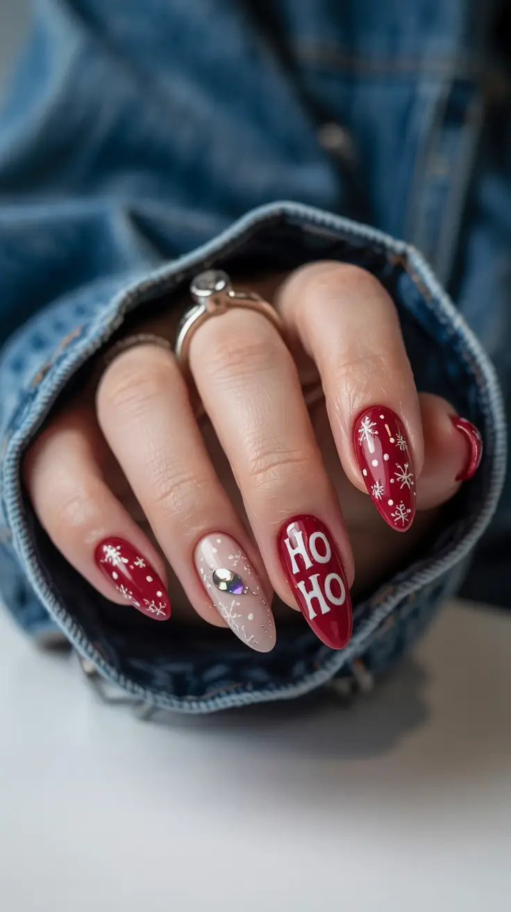 There is no design that shouts Christmas in pure jubilation more than this one, despite its bold red nails, sparkling snowflakes, and the dashing lettering of HO HO which leaves you smiling every time you look at it. It is joyful, assertive and not apathetic about the celebrations.