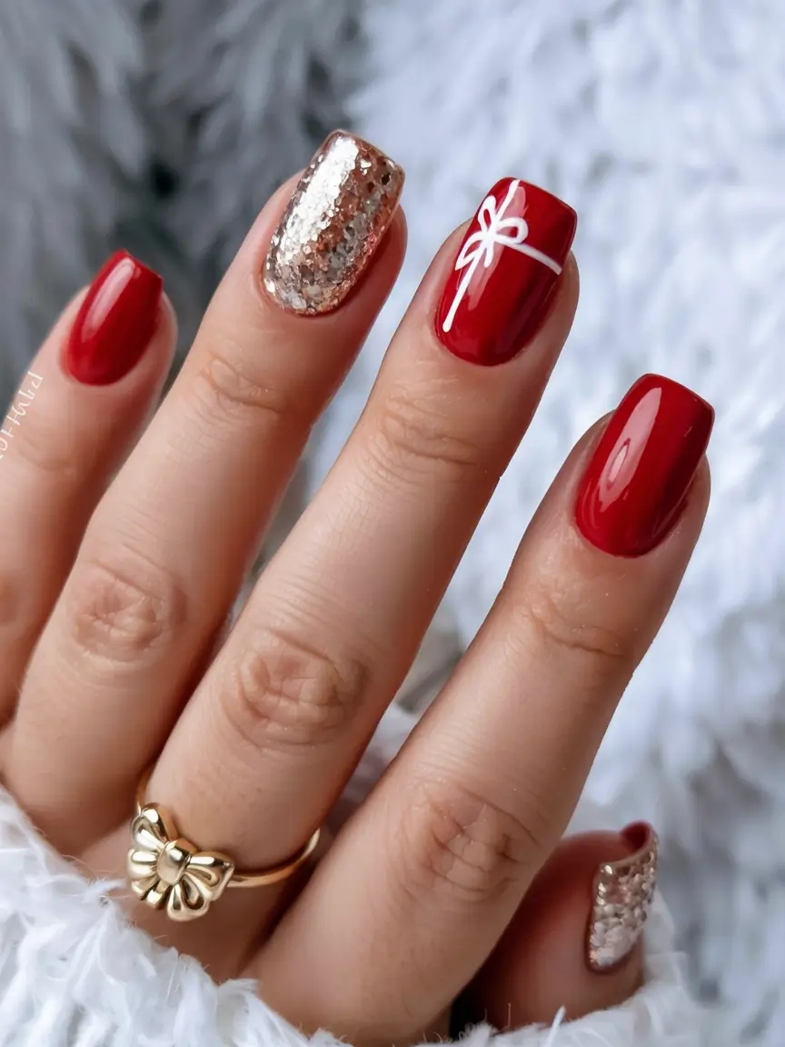This one is like the holidays in a bottle of manicure, red, white and gold mixing and becoming something so festive and certainly glamorous. These alternating patterns, snowflakes and stripes and glitter are all so fun and spontaneous, which is what we all need in December. This design is ideal in the square shape of red christmas nails as everything is balanced with a shiny touch.