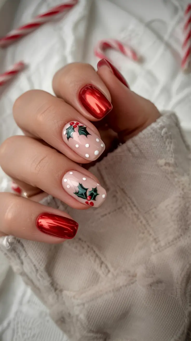 Such nails are all candy-cane fantasy, chrome red and nude blush with hand-painted holly leaves and white snow dots. It is light but bold, and it is ideal when one is in need of a combination of warm nostalgia and smooth shine. The chrome coating gives the impression of a red christmas nails acrylic short mirror-polish perfection and the holly hand drawn makes it individual.