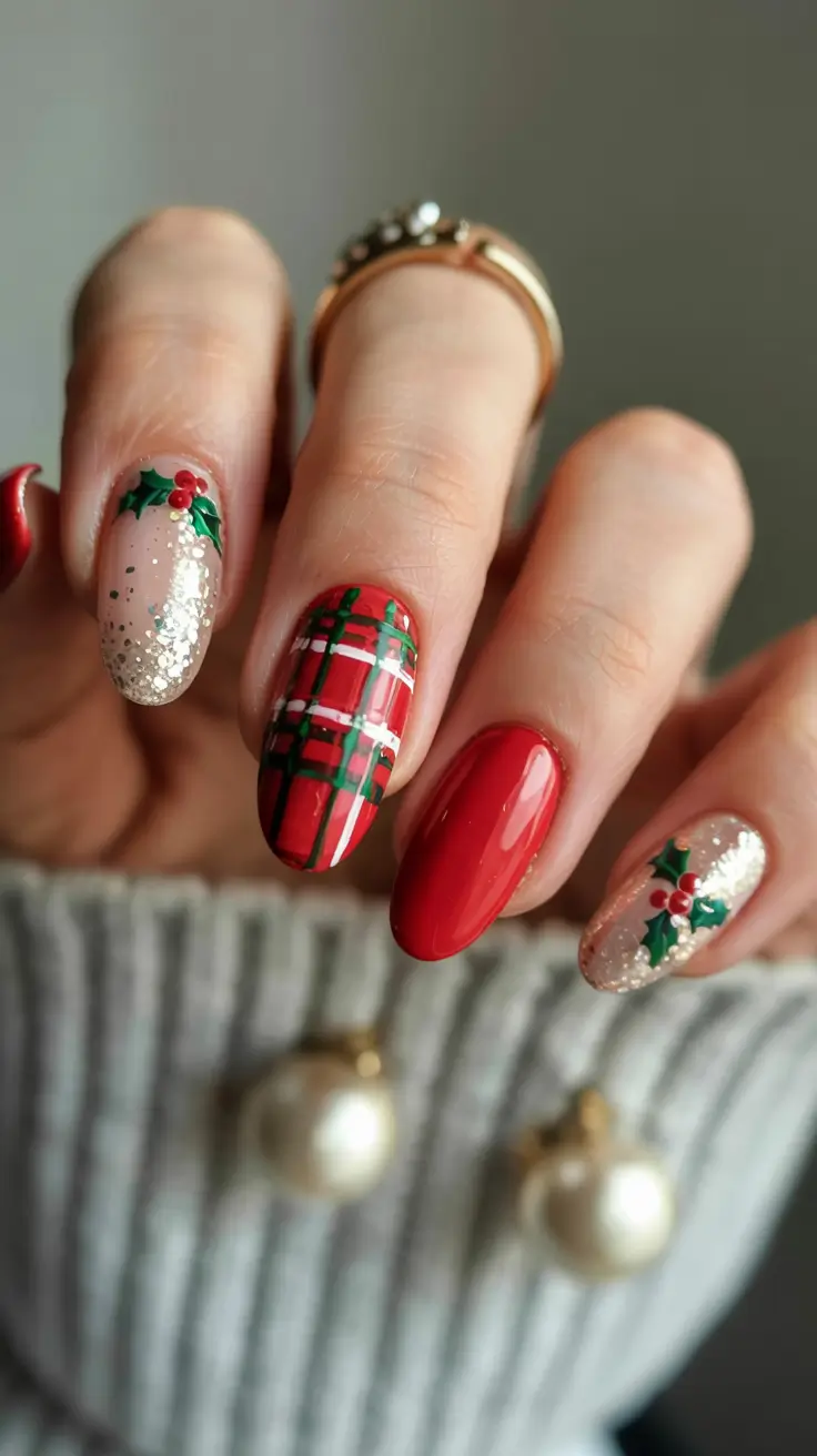 There can be nothing as traditionally as plaid. This manicure combines warm tartan colors and shiny red and gentle gold sparkle to get the final energy of the sweater weather. It is elaborate and does not overpower it, good with red christmas nails in an oval or almond shape.