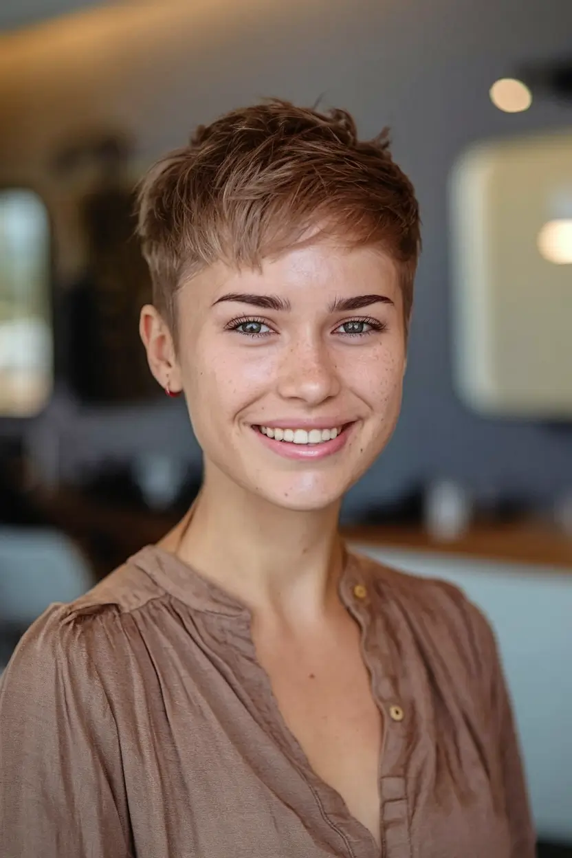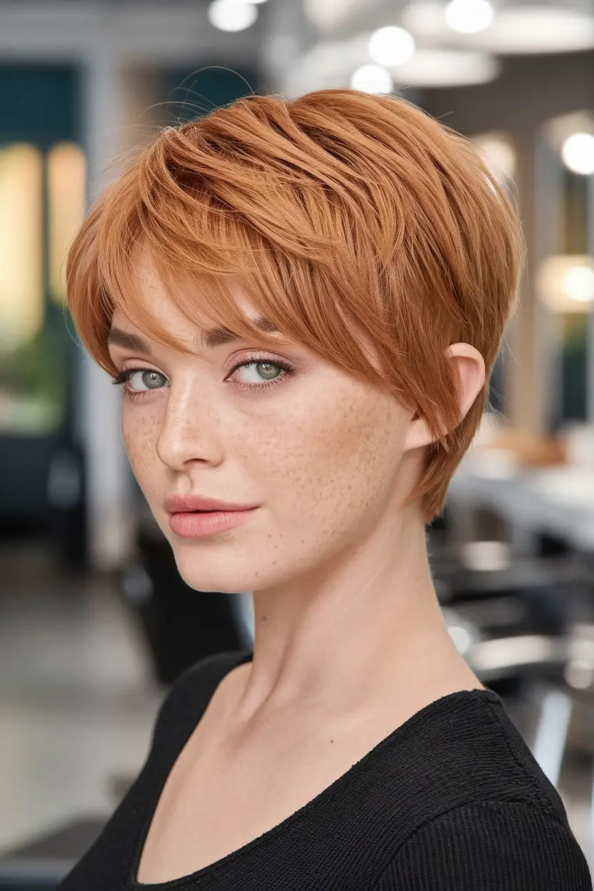 And finally, this warm-toned crop falls right in the middle between pixie and buzz, being short enough to be new and long enough to provide texture and movement. The slightly dishevelled fringe cuts the brow line and the whole profile remains tidy and adaptable. It is perfect when one wants to have fall short haircuts that go with little effort.