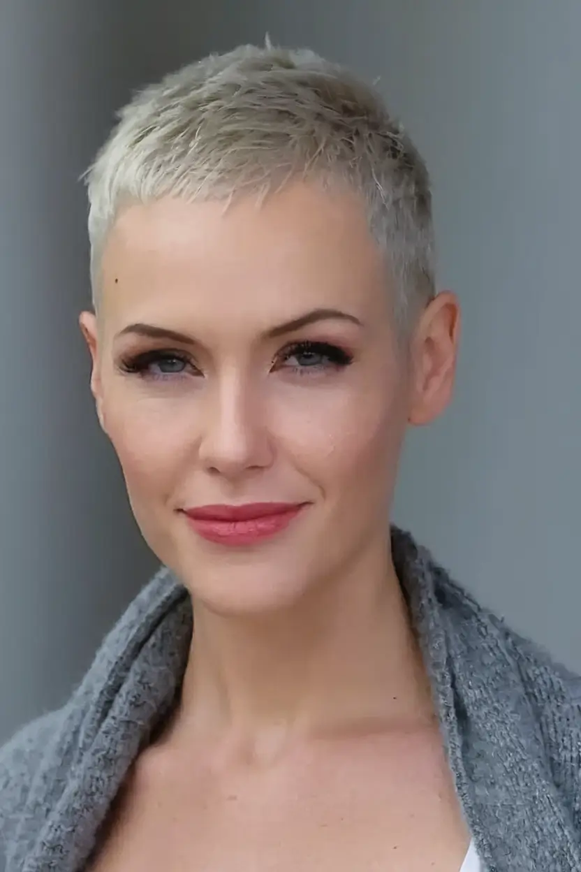 This subtle micro pixie, colored in the most delicate buttery blonde is all minimalism and a hint of mischief. The fringe is baby-short, barely touching the brows and the crown is slightly raised to give it a rounded look. It is the type of cut that you wear when you desire your features and your fall wardrobe to make the statement.