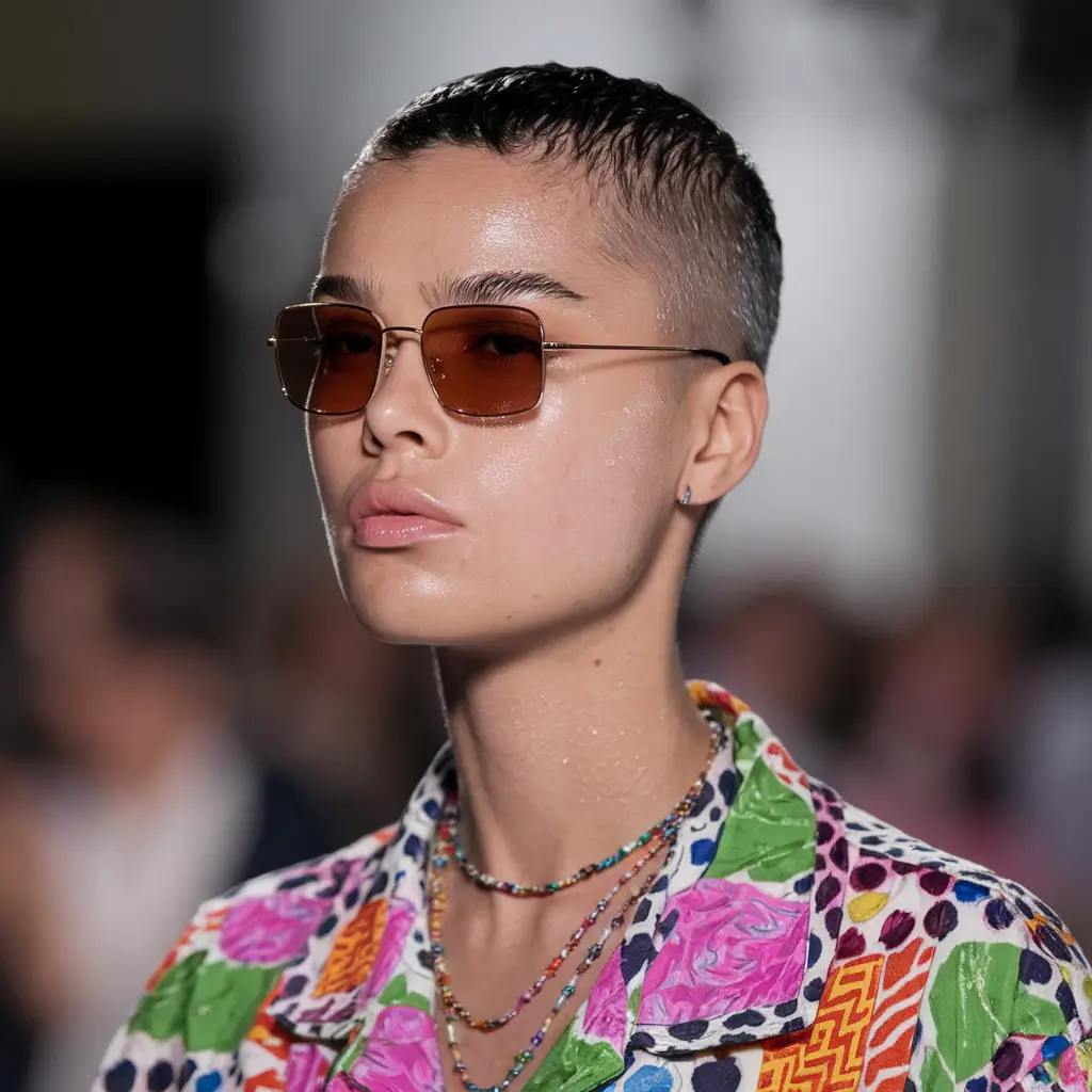 For maintenance, hydration is key. I’d use Briogeo’s Don’t Despair, Repair! Strength + Moisture Leave-In mist on a buzz to keep the scalp and hair in harmony. It is also an excellent time to invest in your brows, earrings and skincare, everything stands out with hair this short.