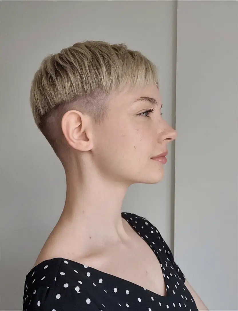 This blonde undercut bowl cut is an eye-catching combination of daring and elegant – it is structured on its top, buzzed sharply on the sides, and it is mixed with a sufficient amount of softness so that it can still be worn. I adore the way that this version is more inclined to clean lines without being harsh, and it will be a perfect reference to the trends of short haircuts in the fall 2025.