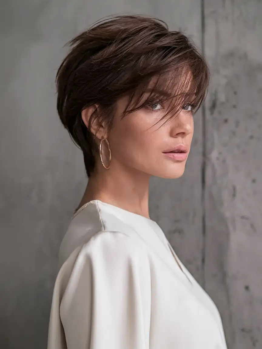 This deep, coffee-toned pixie is all about soft, natural texture. The fringe is gently choppy, and the sides taper close without looking severe. It feels very grounded — like the perfect short haircut for fall when you want something cozy but cool. The rich brunette hue adds warmth and depth, which always feels right when the weather shifts.