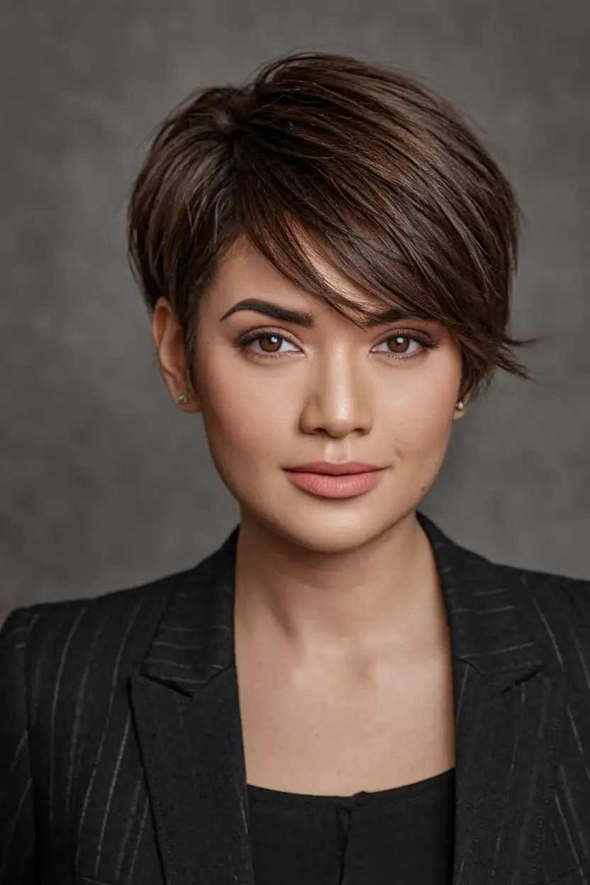 This look practically struts on its own. The pixie is close-cropped, slicked down in liquid shine, as if all the polished runway energy were transmitted without making it any less wearable. It is no wonder that short pixie haircuts fall colors are becoming popular: once combined with a deep brunette or espresso gloss, they put your bone structure on the front burner.