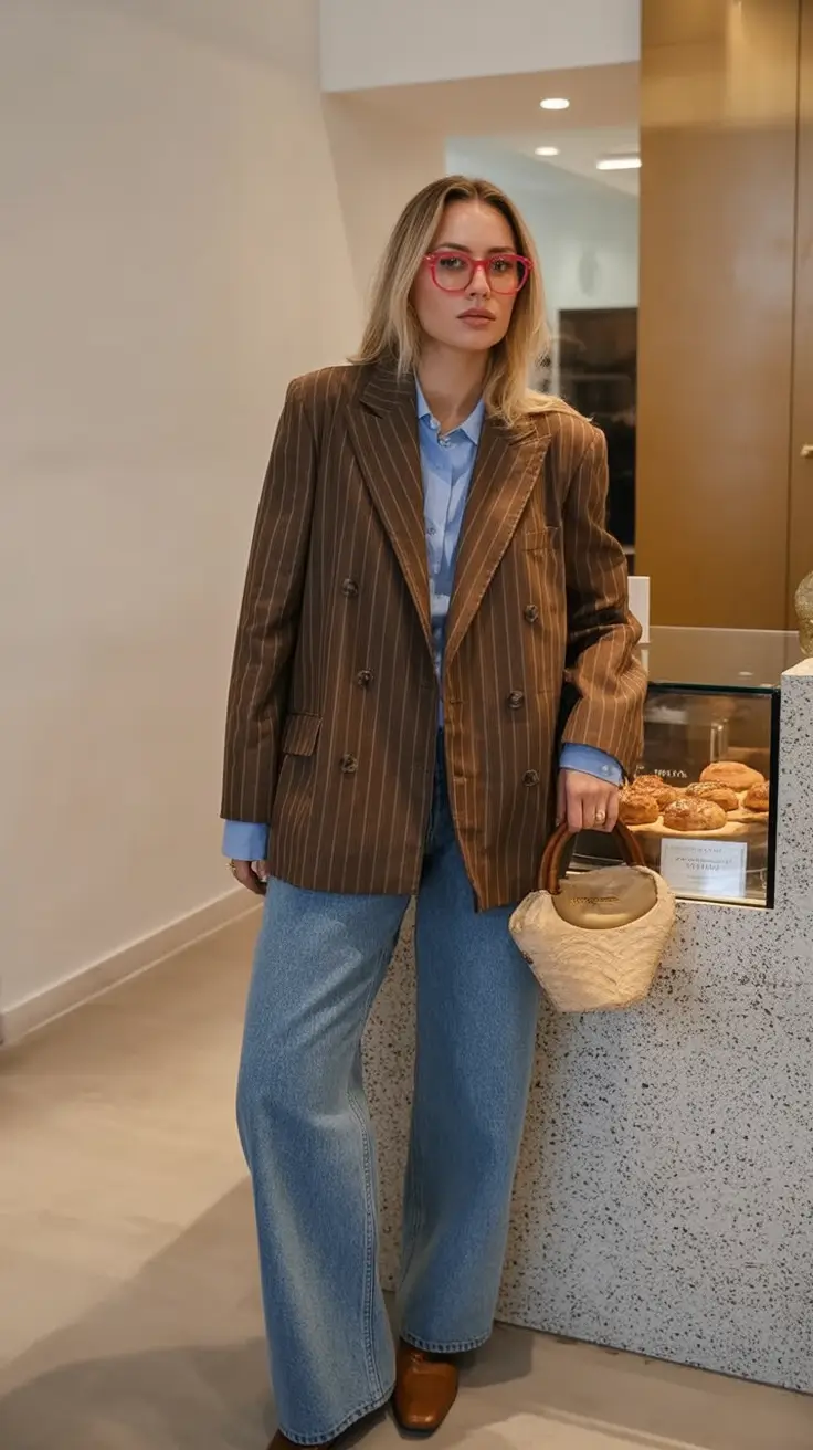 There’s a quiet sophistication in a brown pinstripe blazer — it carries that old-school authority but feels lighter when paired with a soft blue shirt and wide-leg jeans. It is a perfect balance: organized on the upper part and casual on the lower part. The bag of woven material and leather shoes complete the story with a slight texture and warmth. It’s an outfit that’s both functional and flirtatious with professionalism, without trying too hard.