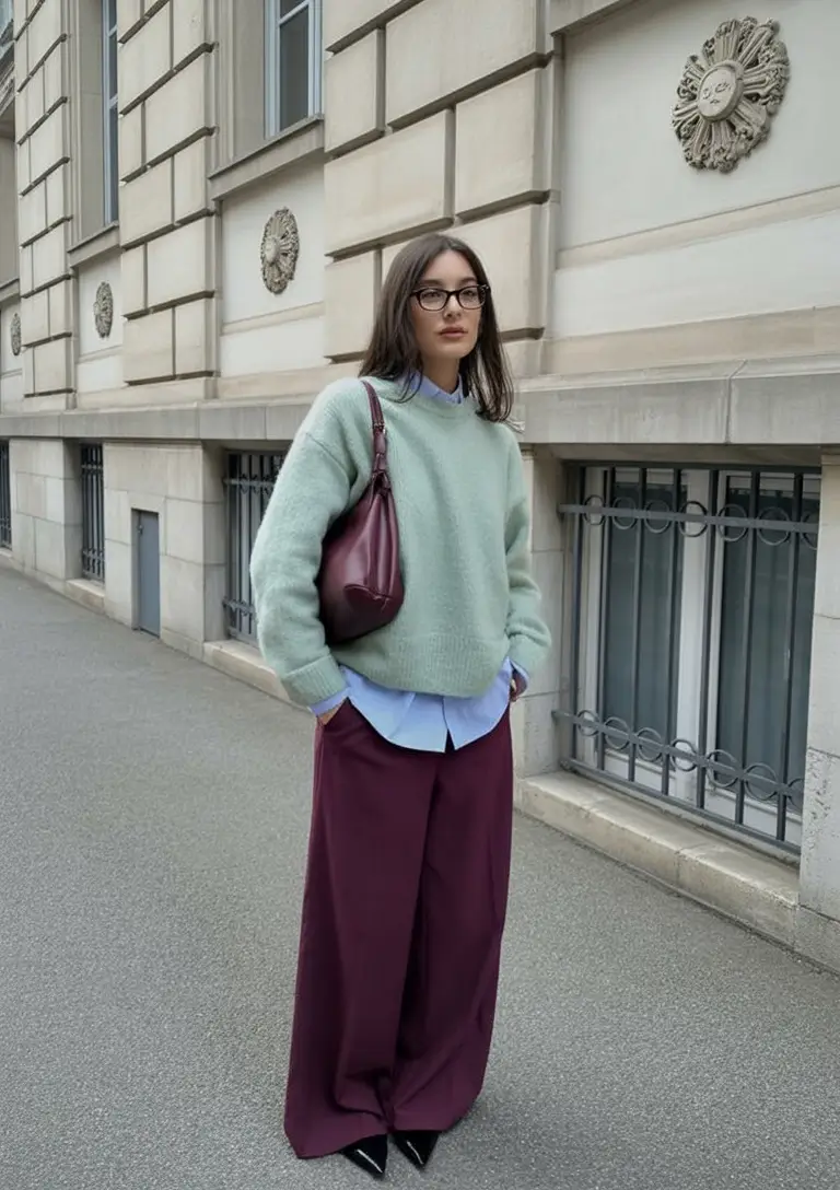 Mint green and plum – this is a strange combination that, nevertheless, makes perfect sense. The sweater worn on top of a structured blue shirt provides that comfort or appearance of staying warm and also being precise that characterizes the work wear in the contemporary world. It is new, natural, and somewhat artistic the type of appearance that catches eyes without making the effort.