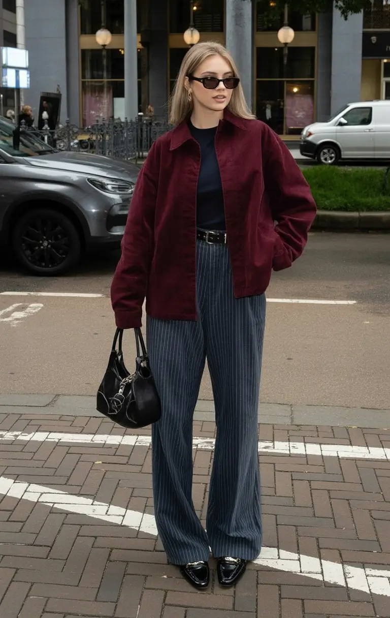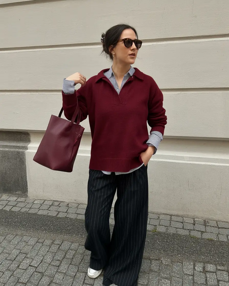 A sweater over a striped shirt burgundy- it is old school, but make it new. This combination of vivid colour and design gives the outfit richness but does not overload it. Extensive pinstripe pants stretch the frame forming a loose but orderly piece that characterizes 2026. It is assertive, comfortable and unobtrusive artistic.