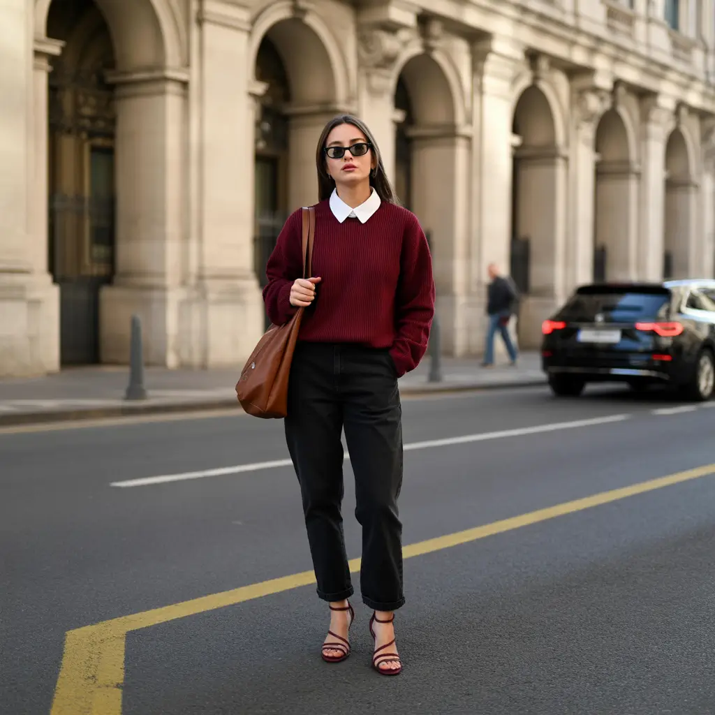 This is a pure modern minimalism in burgundy and white combination. The sweater is soft but put together and the white collar is crisp and sharp. It is paired with black cropped pants and heeled sandals and is a sophisticated version of business casual clothing in spring lightweight, breathable, and undoubtedly fashionable.