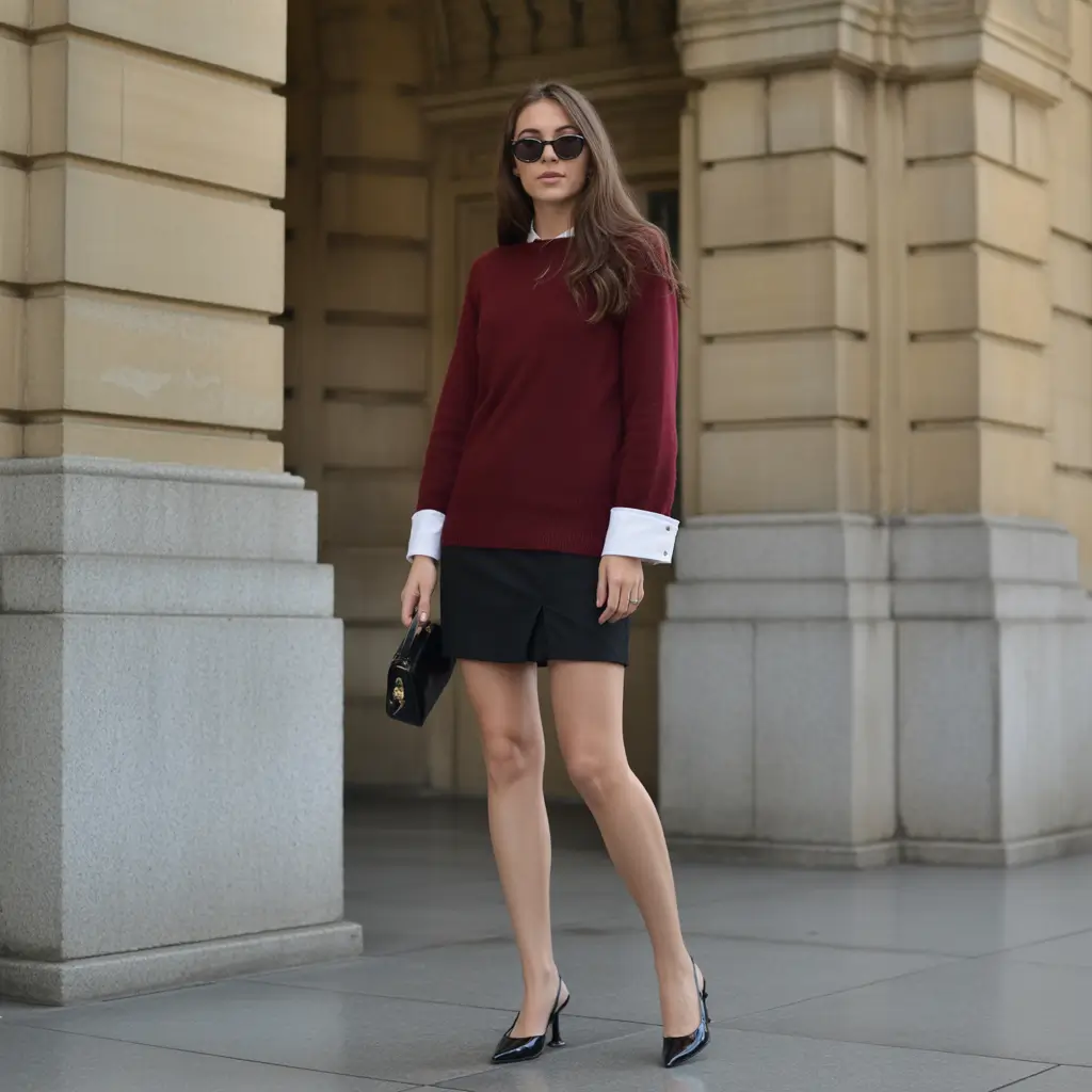A long burgundy sweater above a white shirt, a short black, slim, and powerful skirt. The cuffs sticking out beneath the sleeves are sharp and present refined look, and topped with pointed heels, the entire mood is lifted. It is not the usual office attire, but it is a perfect fit in the realm of creative business casual dresses on women.