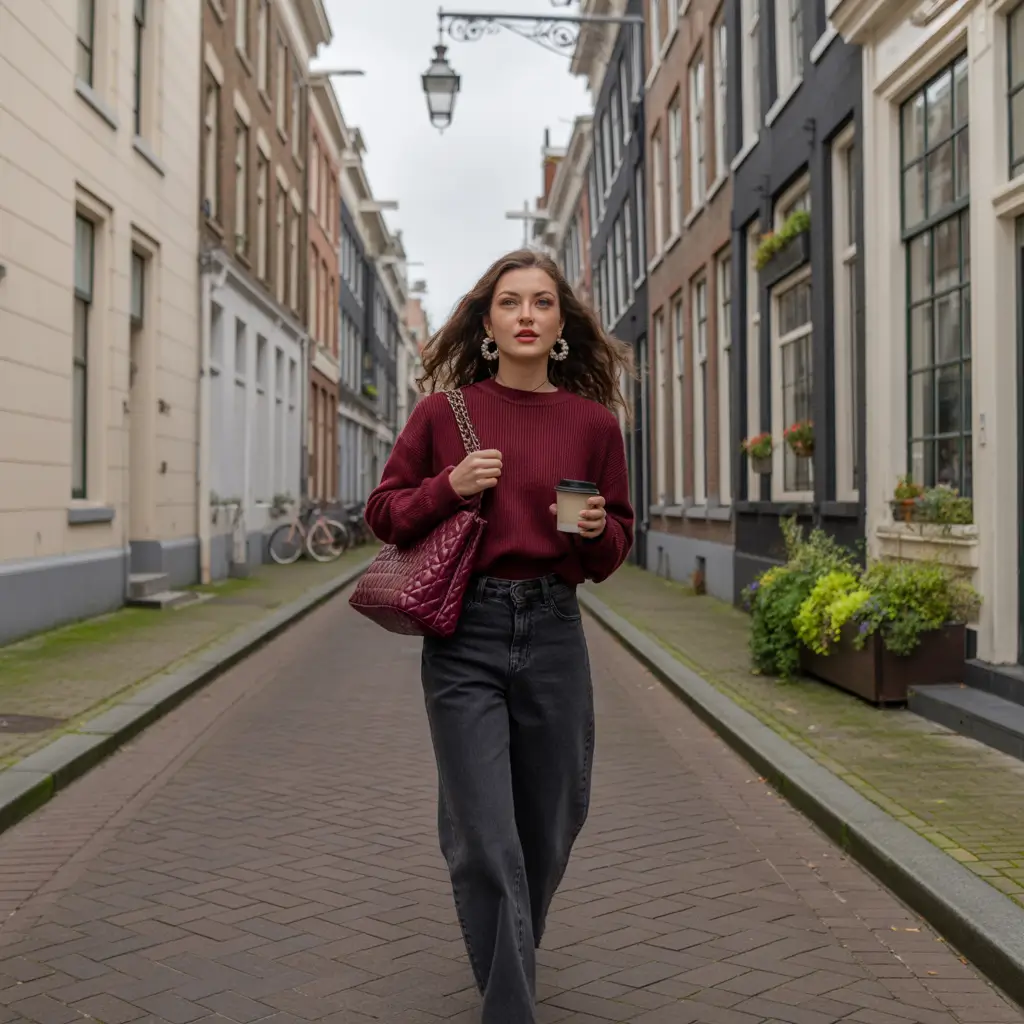 Burgundy is that colour that slips under the carpet and makes people look. In this case it takes the center stage, with charcoal jeans and a bag in the form of quilt, the same color as the sweater. It is plain, yet full of detail in all the details the plush texture of knit, the non-slippery surface of jeans, the gentle lustre of the bag. That is the way I envision business casual clothes in fall: touchable, colorful, and with a touch of subtle masculinity.