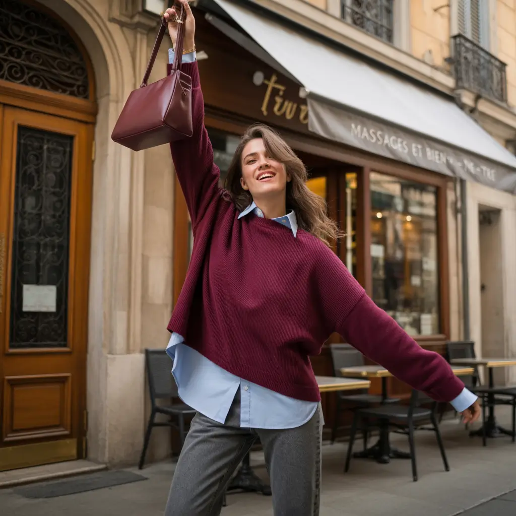 All an outfit requires is a bit of cheer sometimes. This one radiates it. An oversized burgundy sweater over a blue top is an immediate color juxtaposition of a serious work outfit and a light one that one could take on a whim to the local cafeteria. The loose silhouette is up-to-date, and the baggy shape and the slim jeans hold the balance. It is contemporary, fashionable and light.