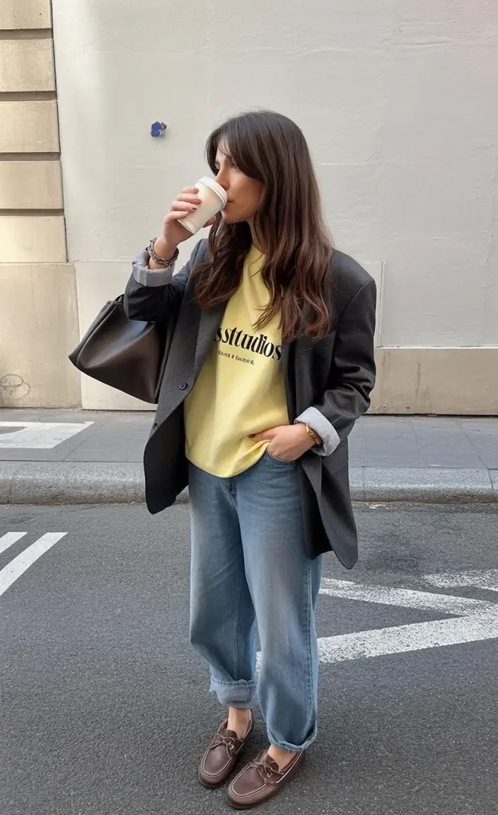 The gray blazer and lemon sweatshirt duo perfectly captures what 2026 style is leaning toward — a calm kind of cool. It is not too formal at all, and at the same time, not too formatted as to fail any office exam. The soft denim and loafers create a silhouette that’s relaxed yet composed, ideal for hybrid workdays or creative teams where individuality counts as much as output.