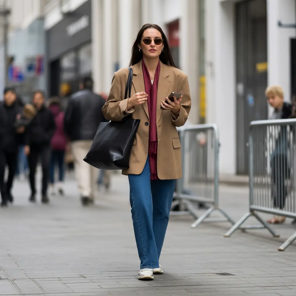 I have always thought that the outerwear makes the tone. Denim is automatically upgraded with the use of clean lines that run through the blazer making it deliberate and classy. The giant tote, which is an essential item of a person who has to move all the time, is practical and not depending on style. The trick behind it is the balance of color, namely, the neutral base, the detail in the accent, and few accessories.