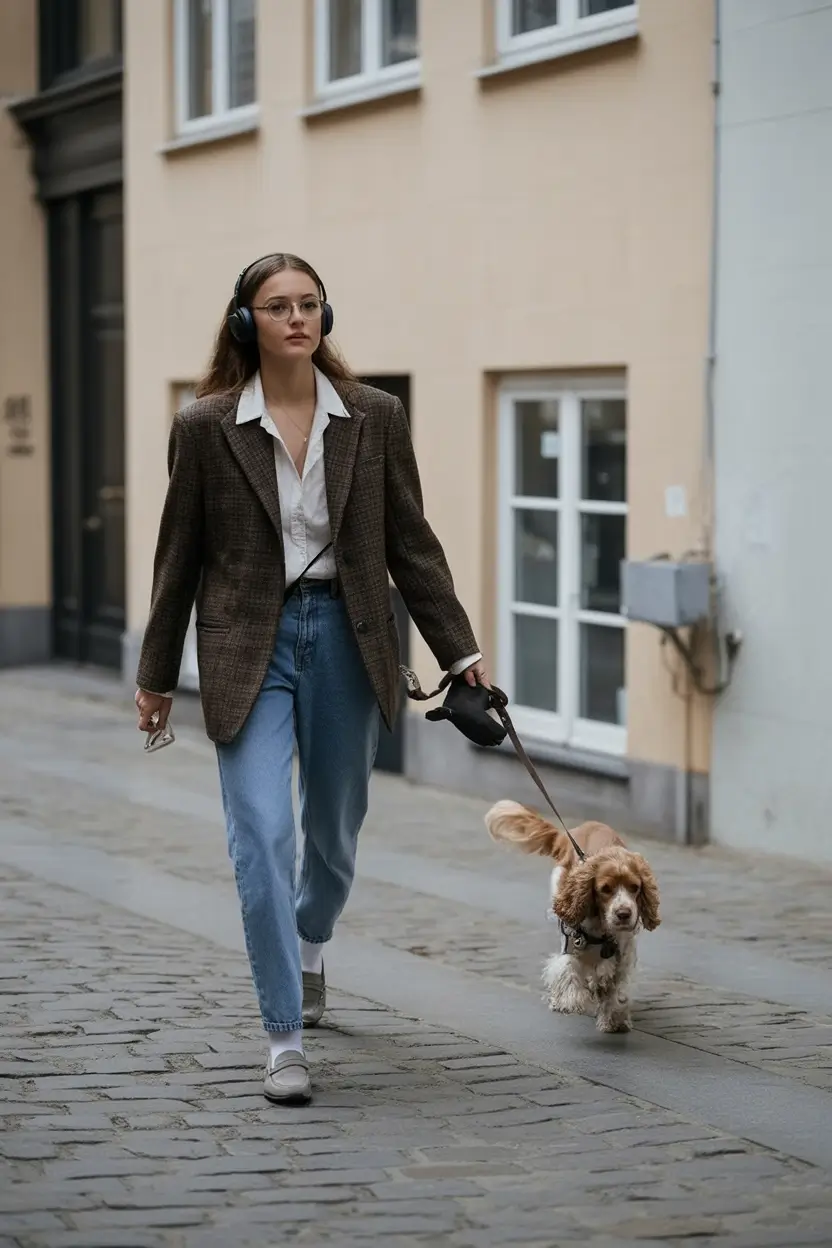 The combination of masculinity tailoring and feminine comfort is what I like about this outfit. The hardness of the blazer is in contrast to the looseness of the shirt and jeans. Making its way and adding loafers or neutral sneakers makes it workable in the city life even better with oversized headphones, which makes it personal and makes the whole look modern.