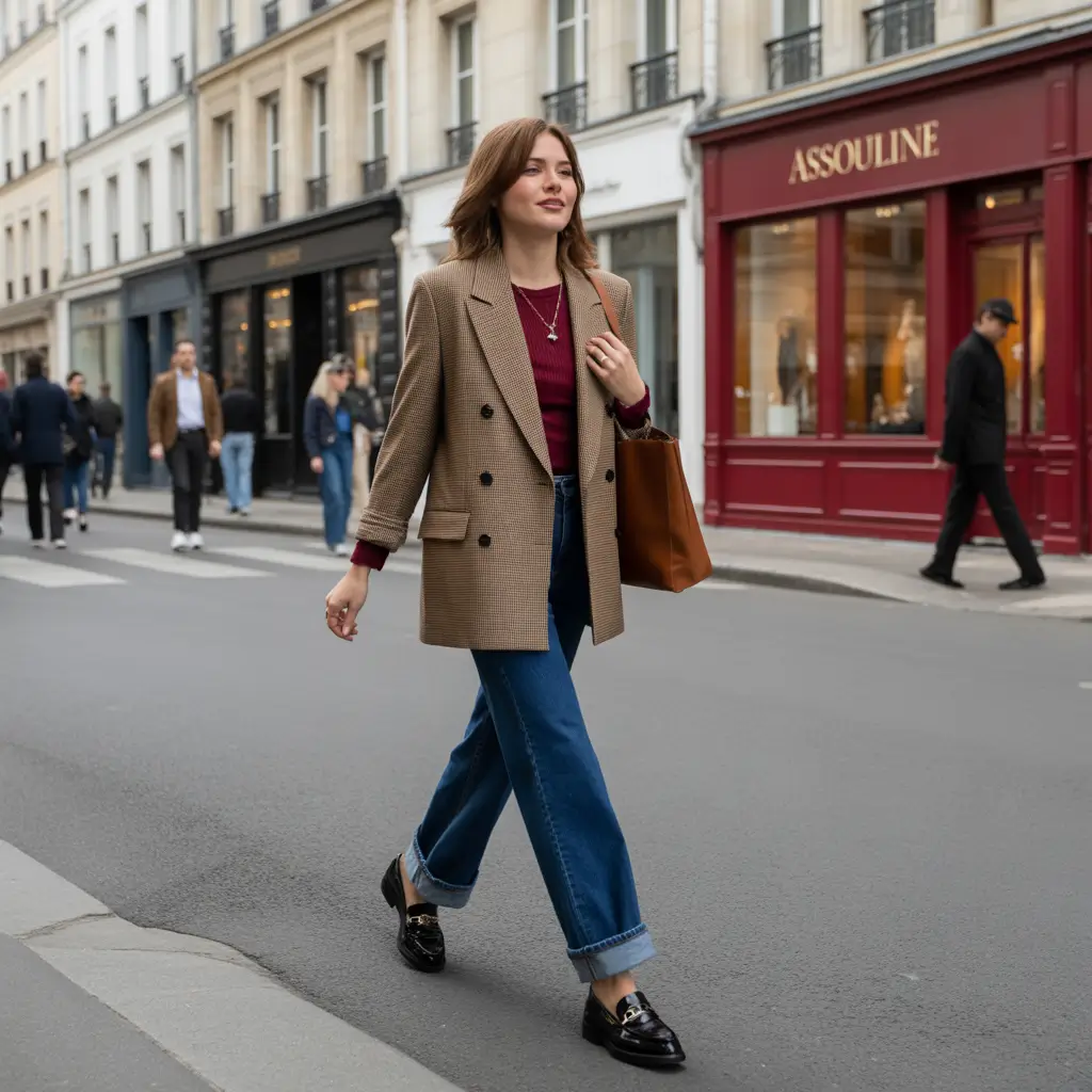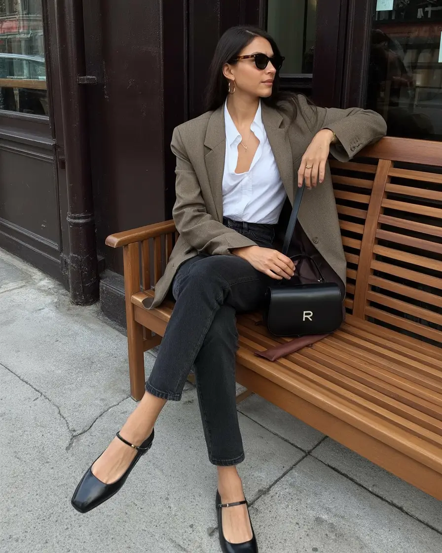 Such a mix of a blazer that could be checked, a strict white shirt, and light denim makes one think about a new movie set, it is quietly confident, yet it is so easy to look good. The appearance represents the renaissance of classic fabrics in the daily lifestyle, where tradition and comfort collide. It fits the business casual clothes perfectly in the fall and when order and rest require to co-exist.