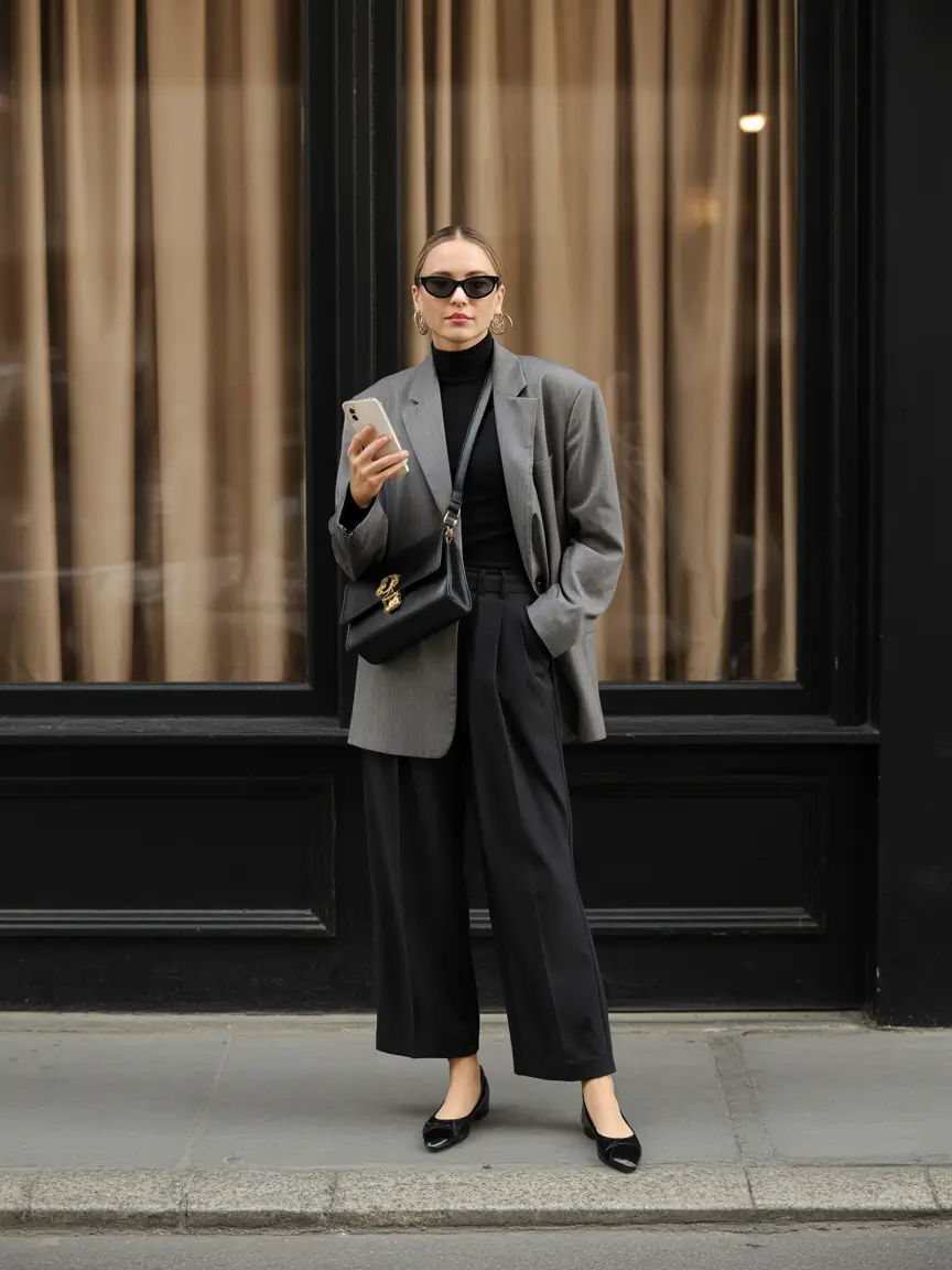 Black outfits of any kind have always been associated with quiet power and this one embodies it perfectly. Charcoal-gray blazer and the same wide-leg trousers create a perfect base that is sleek and the fitted turtleneck adds depth. Flats are black and the bag and earrings are of gold hoops, adding texture and depth without disrupting the minimalism.
