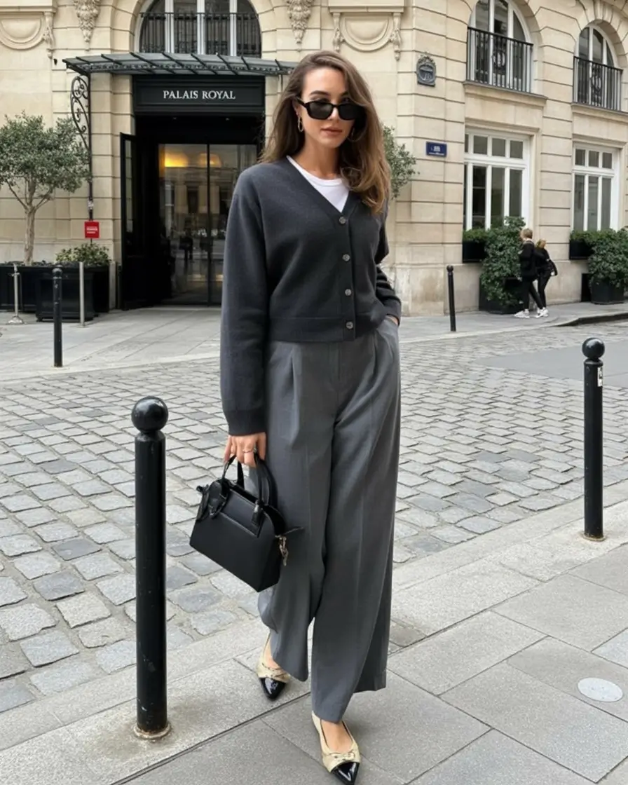 This is one of those few glances that are comfortable as well as elegant. The flowing gray cardigan with customized trousers is not only warm and airy but certainly refined. The plain white tee under it is enough to make it fresh without breaking the monochrome. It is among my favorite examples of transitional business casual clothes in the spring – refined, utilitarian and exquisitely balanced.