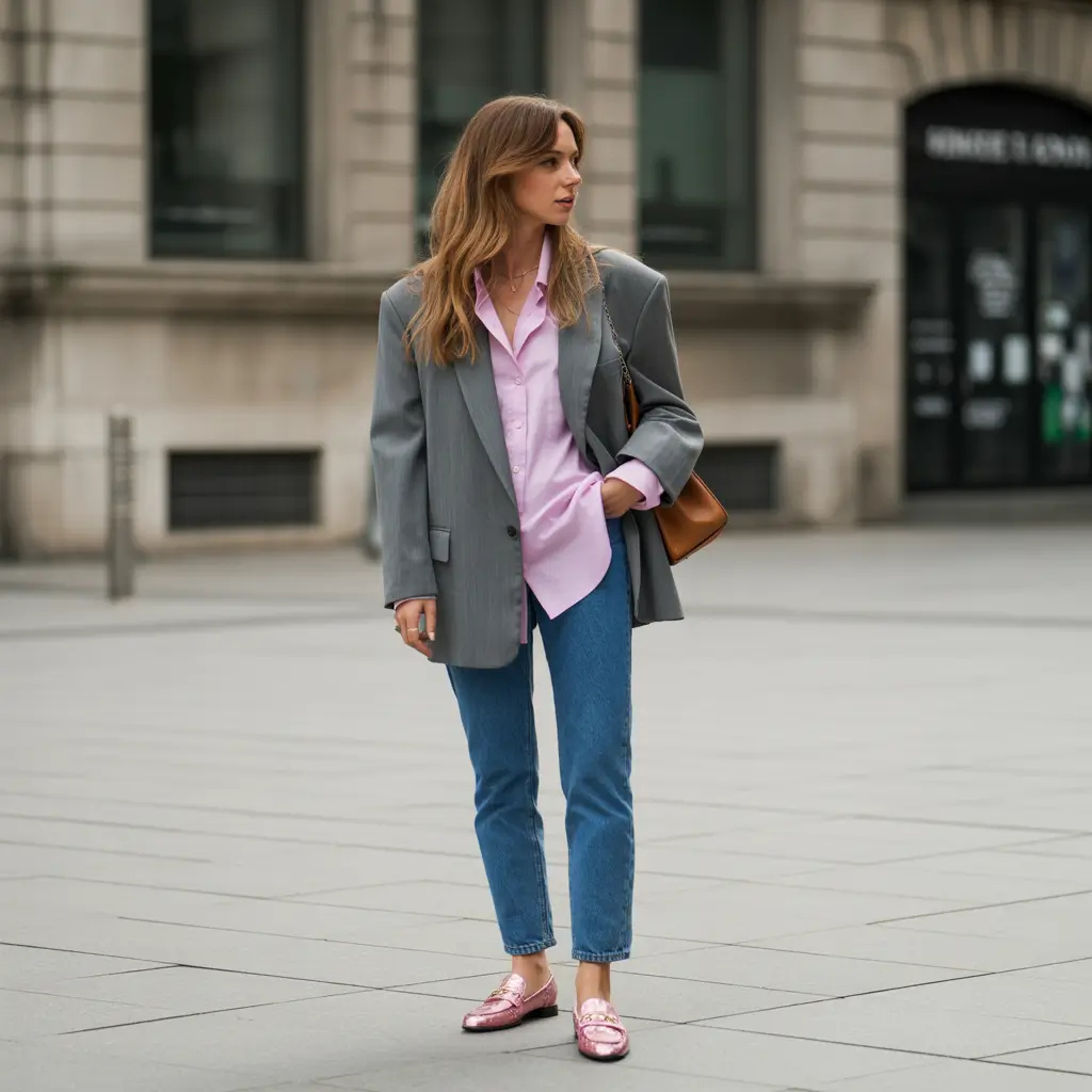 The tee and jeans are soft and the boxy blazer structure runs in a contrast with it. It is not high-brow, yet it is well edited. The outfit is brought out in loafers so that it is wearable and elegant. This appearance makes me remember that power dressing does not necessarily need to be serious all the time just knowing how to balance comfort and sophistication.