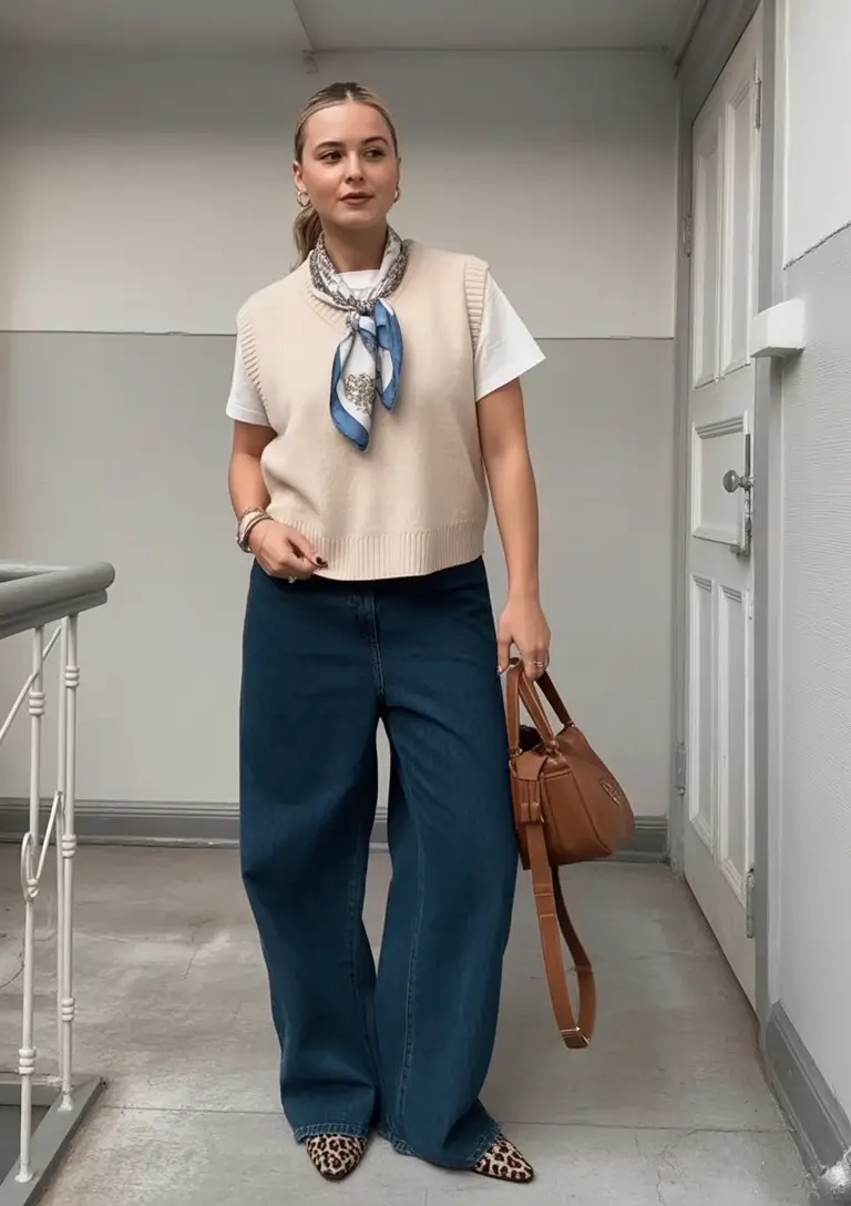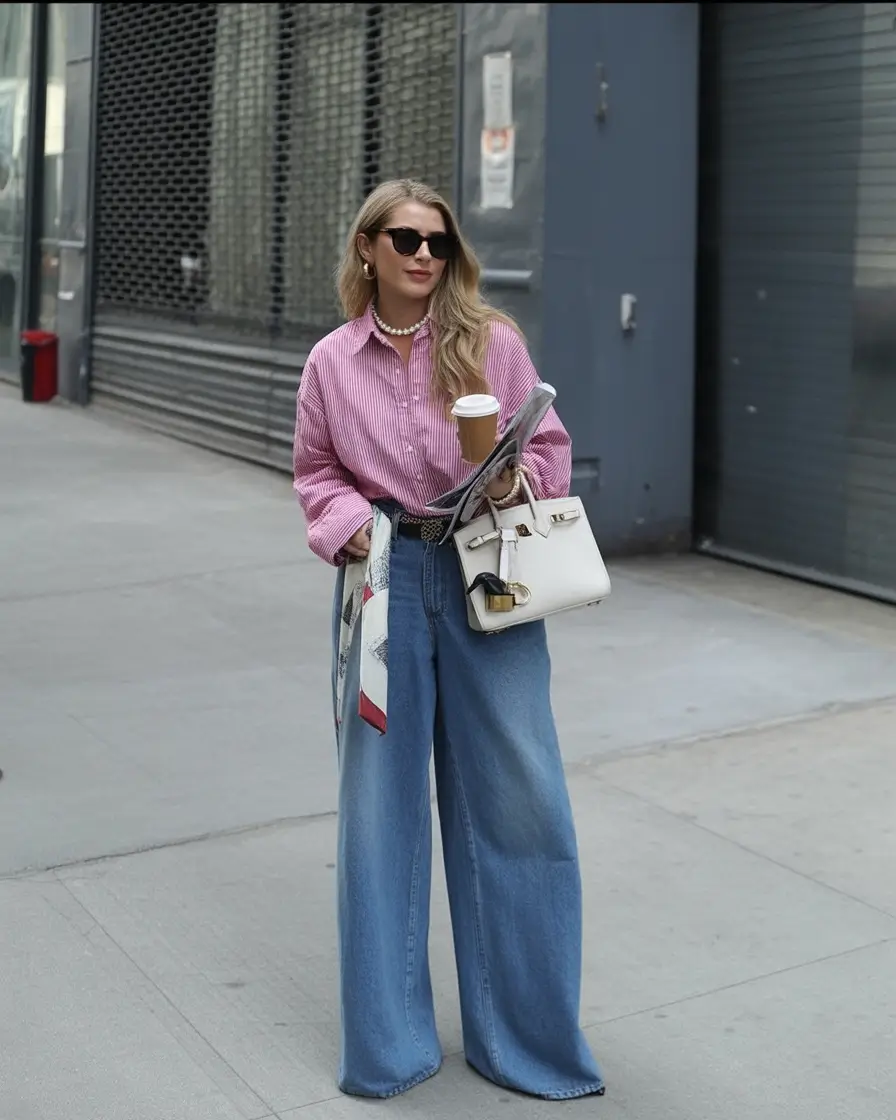 Few things say effortless sophistication like a pair of wide-leg jeans paired with a tucked-in striped shirt. This mix reminds me of the ancient American comfort the ease of a little preparation, the power of a little power. The pearl necklace and white structured bag are added to provide the touch of elegance, and the scarf is tipped by the traditional European street style. Together, it’s a look that feels high-end but approachable.