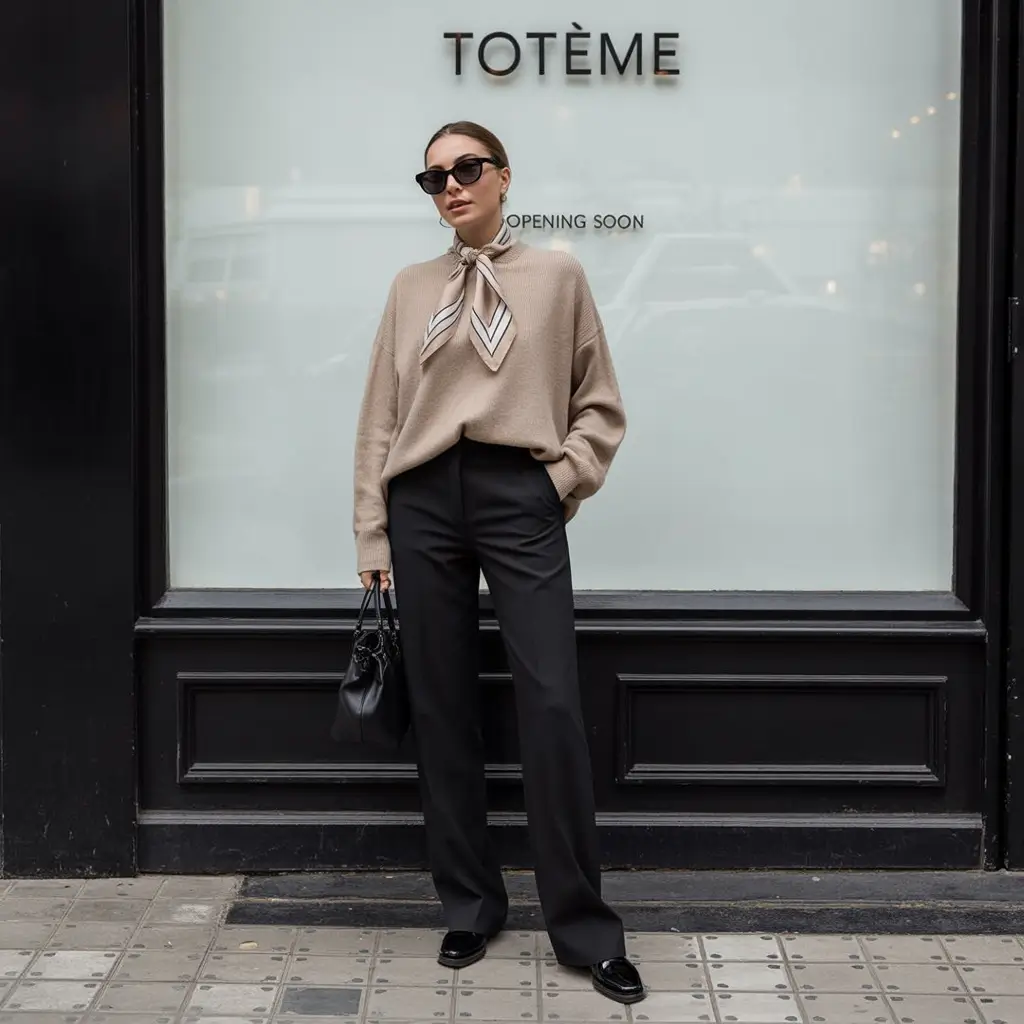 The presence of texture here is outstanding: the knit, the structured pants, and the shiny ends of the pointed flats. It is minimalism with something in mind. The tiny black bag is just the thing on account that it is practical, and not fancy. Subdued jewelry, casual hair, and sunglasses also add the tone of quiet luxury.