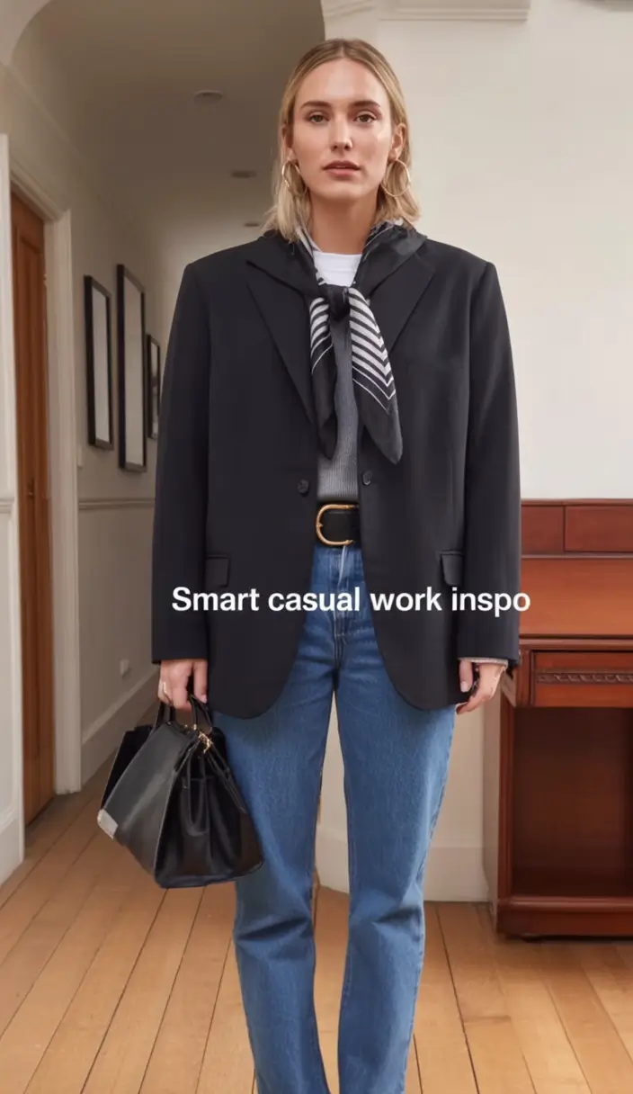 That is the case when I am referring to modern polish: a black jacket over jeans, a warm scarf, and a powerful bag to close the deal. It is a combination of clever and casual, which perfectly reflects 2026 business casual style of dressing. The blazer construction is a nice complement to the comfort of the jeans which produces that relaxed balance which announces: Yes, I am serious–but I am myself.