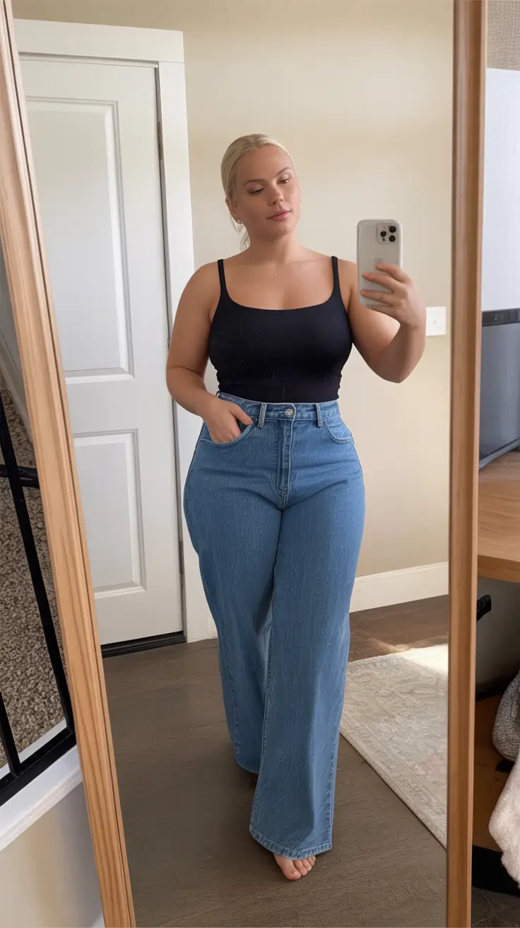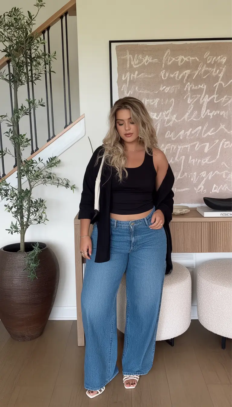 There are some costumes that get you in a state of feeling like yourself again. A tank with cut-offs, big-leg jeans and an oversized blazer — this is the final combination of sophistication and comfort. This is the level of curvy outfits jeans energy that I would consider in 2026, feminine, high-waisted, and wearable. It is one of those looks that will turn Fridays to cocktails and never leave any traces of casualness about it.