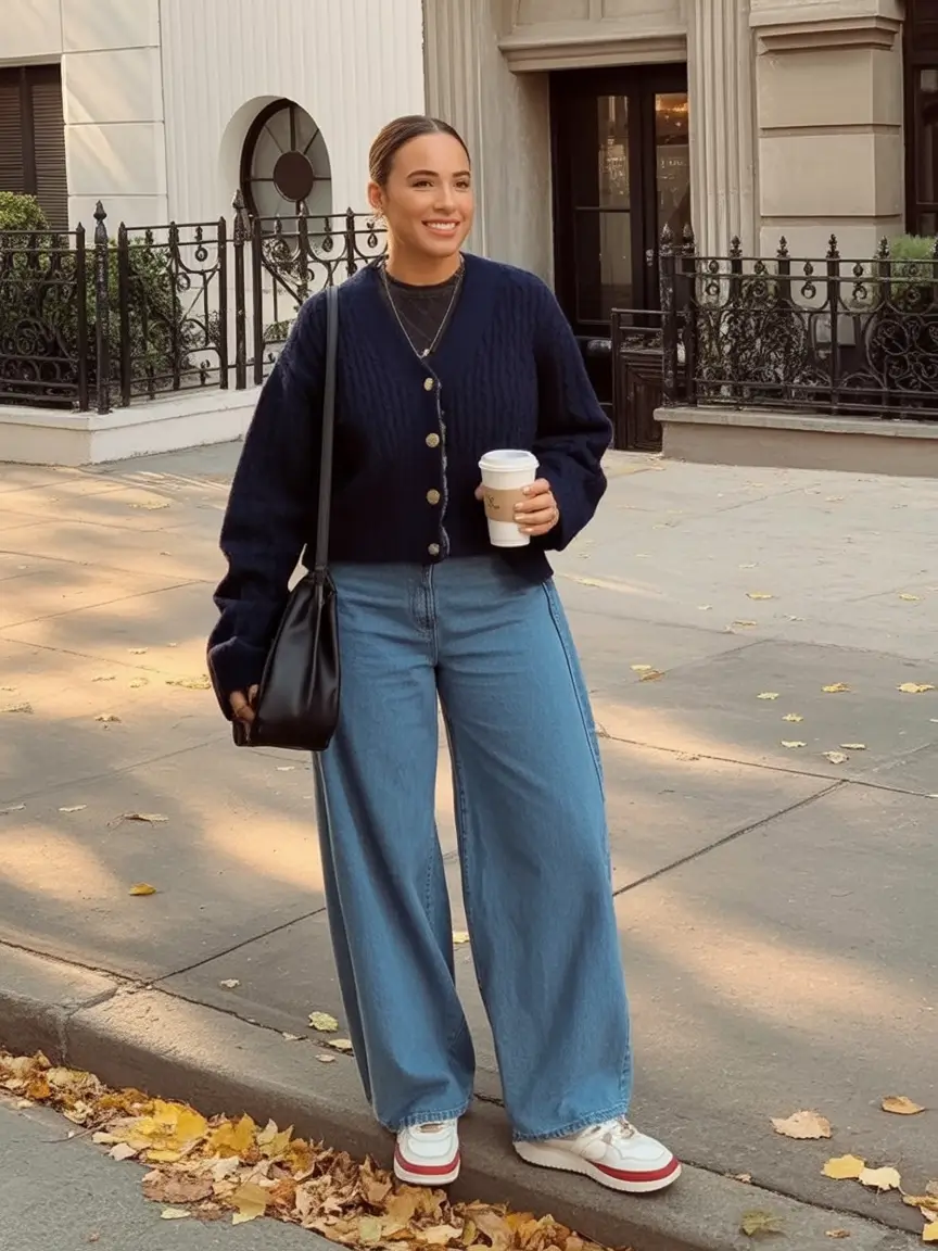 There is no easy like a snugly fitted cardigan and your own beloved wide-leg jeans. And that is that golden mean between the clingy outfits fall comfort and casual street style. The navy knit is warm and cozy, and the denim makes things real and real. Two pairs of white sneakers and a cup of coffee in hand – that is the attitude.