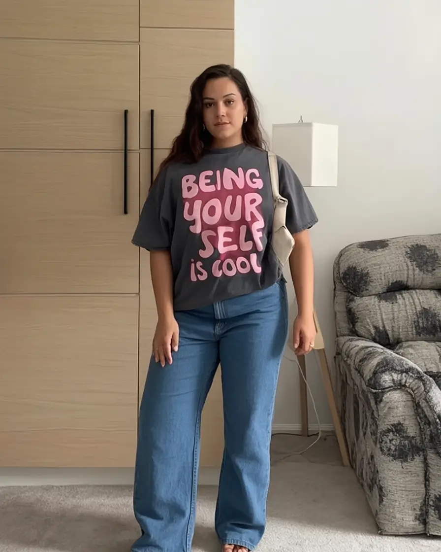 The new power pieces are officially graphic tees. This oversized one, its bold type, the self-confident message make a simple denim combo meaningful. I adore the fact that it is worn into curvy clothes but it still makes it personable. It is easy, comfortable and ideal when it comes to those mornings when you would like your clothes to do the talking.