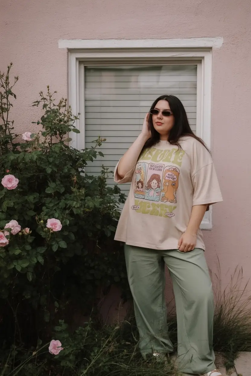 Free and easy, lightweight, and full of life, this garment is what carefree style means. The retro print on the beige graphic tee brings lighthearted nostalgia and the sage-green wide-leg pants are what make the whole outfit softer. They combine to give a freshness that is airy which is perfect with the curvy outfits spring.