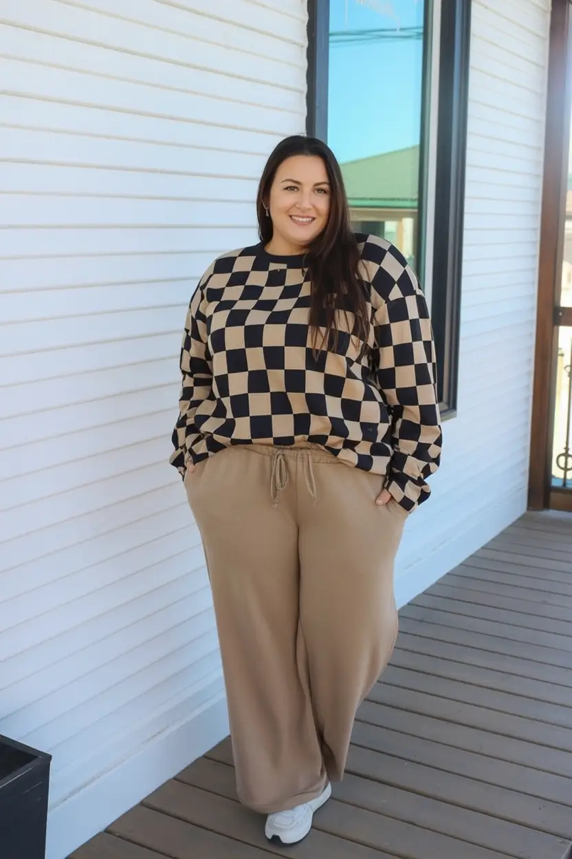 Pattern lovers, here is our lot. A sweater that is checker and a pair of loose beige trousers strike the right balance between warm and cool. It is curvy outfits autumn the right way, the one that is easy to wear, easy to cozy up, easy to add some retro print that makes everything immediately attractive.