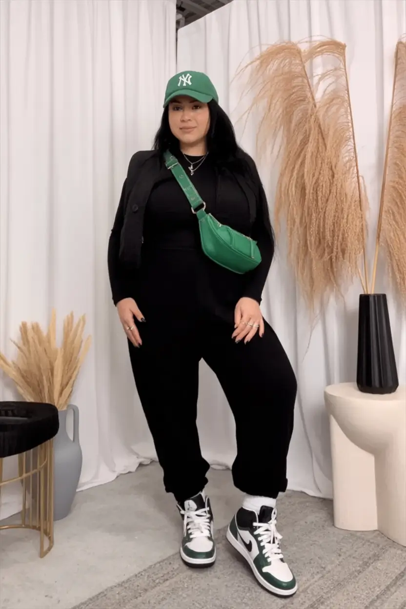 There are days when you can use some color to talk, and this emerald-green accent does so. The crossbody bag and cap bring out the green on a rather smooth base that is all black. It is sporty, fun, and all I adore about the curvy outfits aesthetic with 2026: powerful, comfortable, bold.