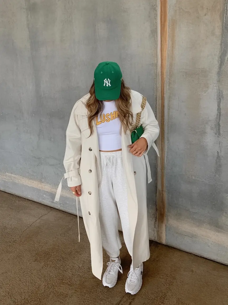 Straussing tonal dressing is something irresistibly cool. The trench coat is cream, the joggers are white, and the crop top is minimal, which forms that soft, modern foundation, but it is the splash of green in the bag and the cap that takes it to the next level. This appearance is the charm of curvy clothes in the spring the shine, the freshness and the full of confidence.