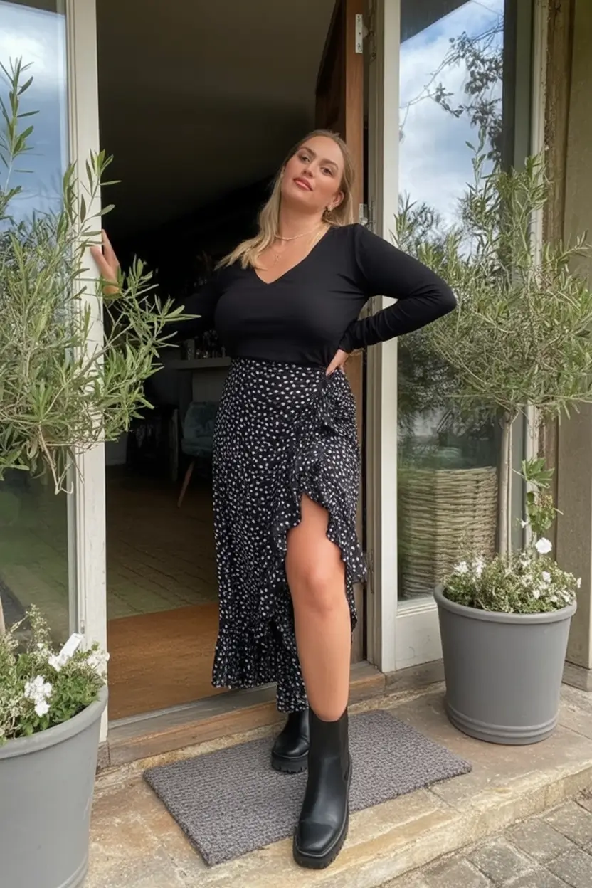 Romance of wrap skirt never dies. In this case, the black top combines with a flowing dotted skirt that barely touches the point of elegance and play. It is tender and arranged – the type of shape that characterizes curvy clothes elegant without ever attempting to be too forceful.