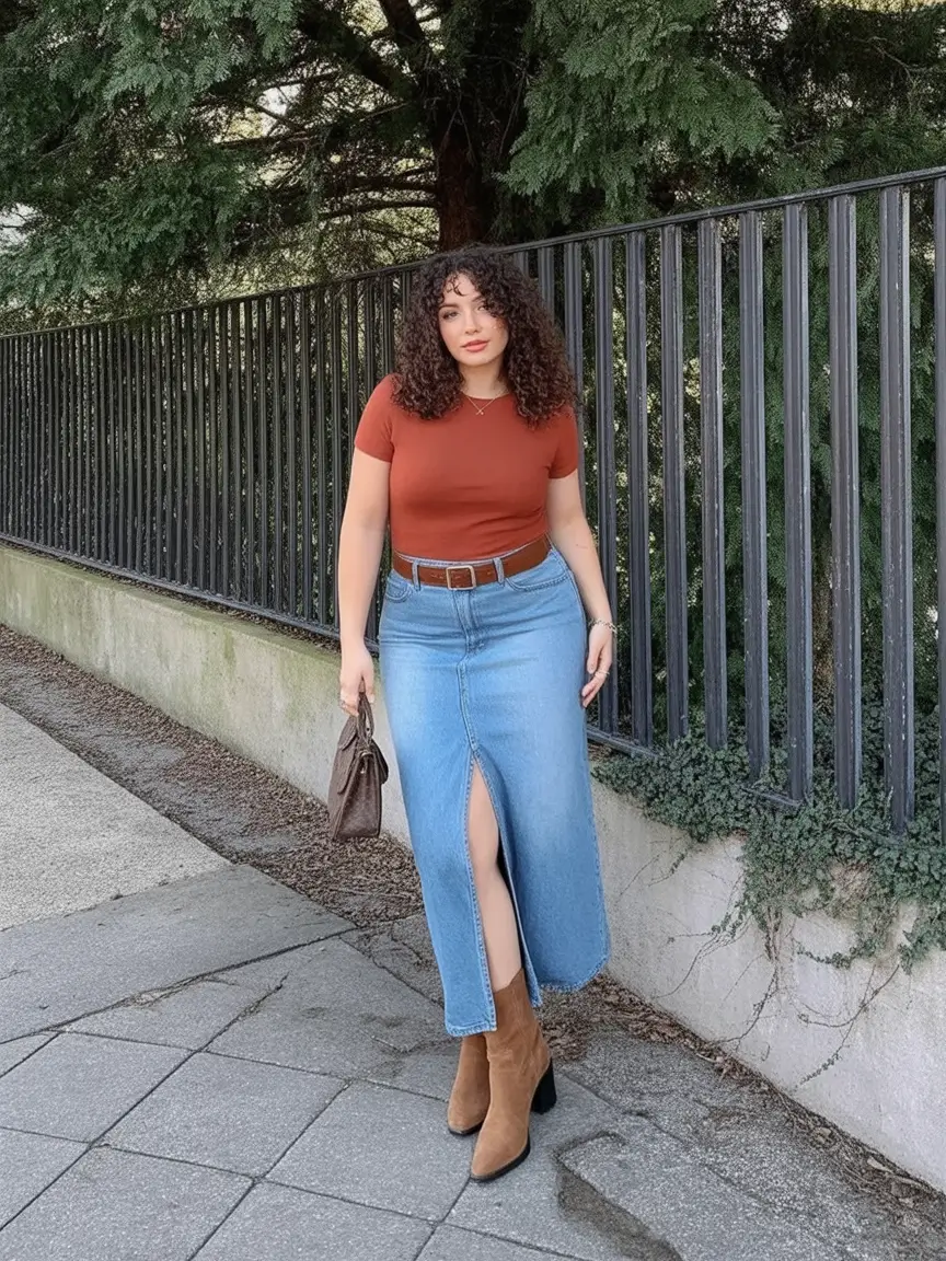 This appearance is like autumn in action — cozy, inviting and rich. Such a carefree combination of structure and softness is so easily achieved by the rust-colored top combined with a high-slit denim skirt. It takes the energy of classic curvy outfits jeans, recreated with a hint of nostalgia.