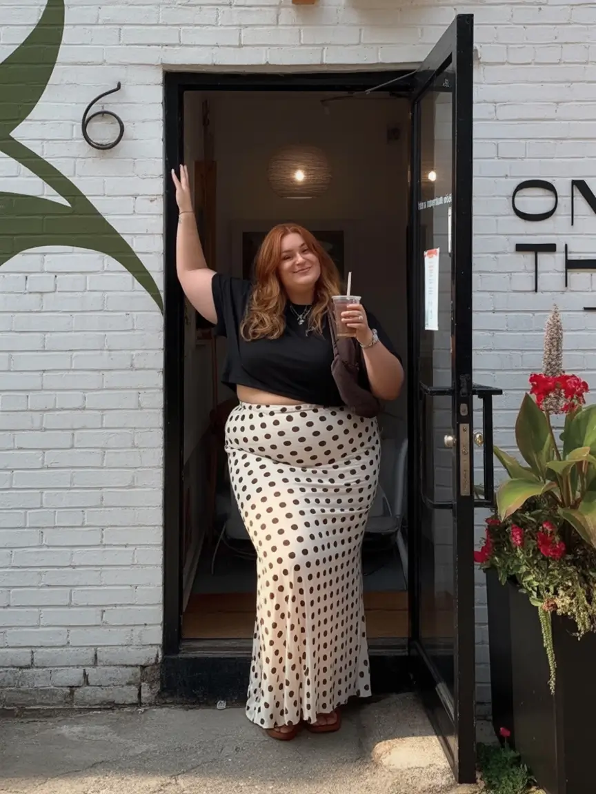 Polka dots have returned, and I can tell that I am not disappointed. Something about them is retro and new at the same time. This satin maxi dress and a short black shirt combine that nonchalant mix of playfulness and elegance that will characterize curvy dresses plus size fashion in 2026.