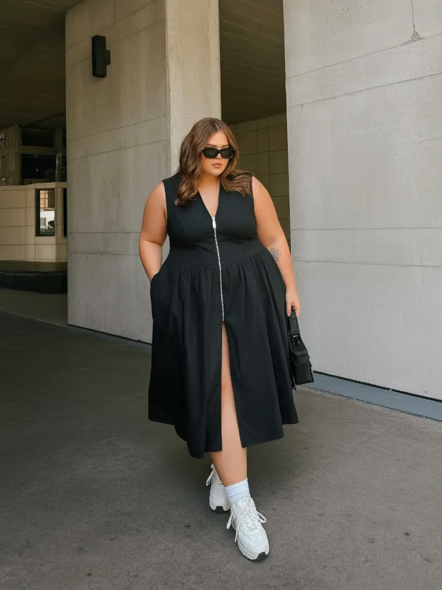 This flow-y front-zipped black dress is the ultimate piece of silent confidence. It simplifies and is active, demonstrating that it is possible to be a strong, minimalistic thing at the same time. The sneakers make it sporty, transforming what otherwise would have been a formal outfit to an easy curvy outfits casuales outfit on a city day.