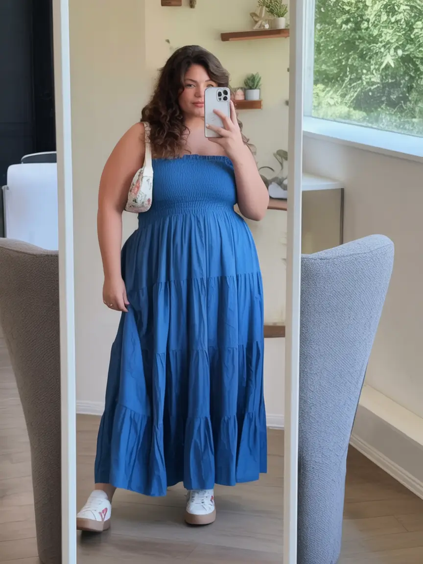 A maxi dress is beautifully easy to wear, and it has something elegantly organic. It is the smocked bodice, with the overlaying skirt, which I refer to as my all-day confidence. The deep blue color is opulent and relaxing — perfect on the curvy clothes in summer when you want lightness and comfort in a garment.