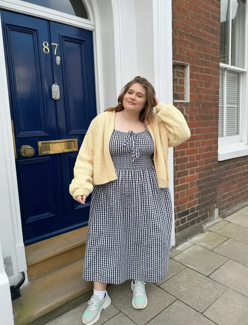 Gingham will never be out of fashion. This midi dress is made of black and white, and it is combined with a soft cardigan, which makes the curvy outfits one dreams of during autumn. It is classic, somewhat nostalgic and interminably flattering.