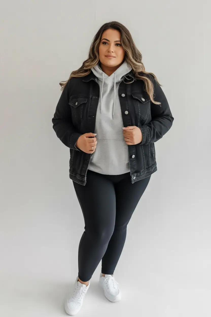 Black leggings, a gray hoodie and a denim jacket – three things that can never be overlooked. This forms the foundation of curvy winter style outfits on the streets: layered, practical, sharp. It is the type of outfit one can never go wrong with whether it is morning errands or just a night out.