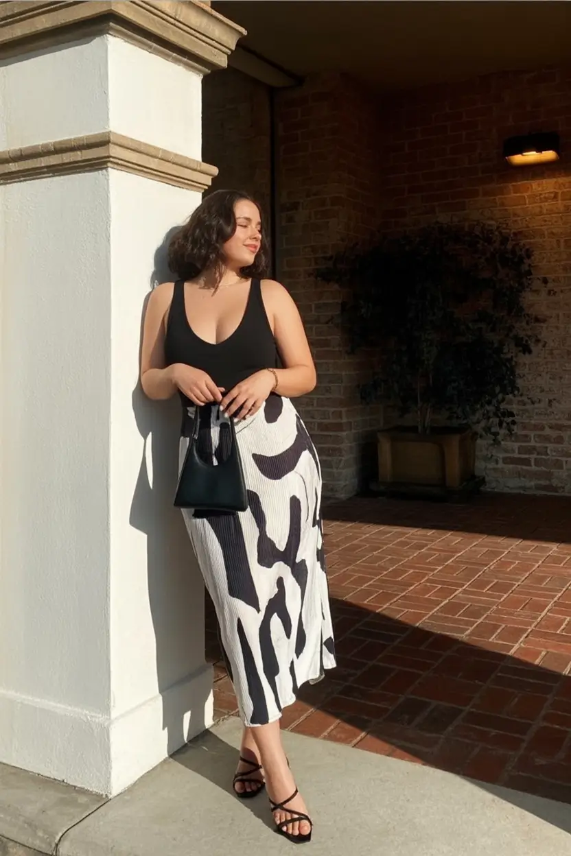 This black and white emerald skirt appearance is like something that can be worn as an art piece. A visual rhythm and balance, the nature of the curvy clothes so gracefully in motion is achieved by the abstract print on the tank top and smoothness. Soft but structured, minimal but magnetic.