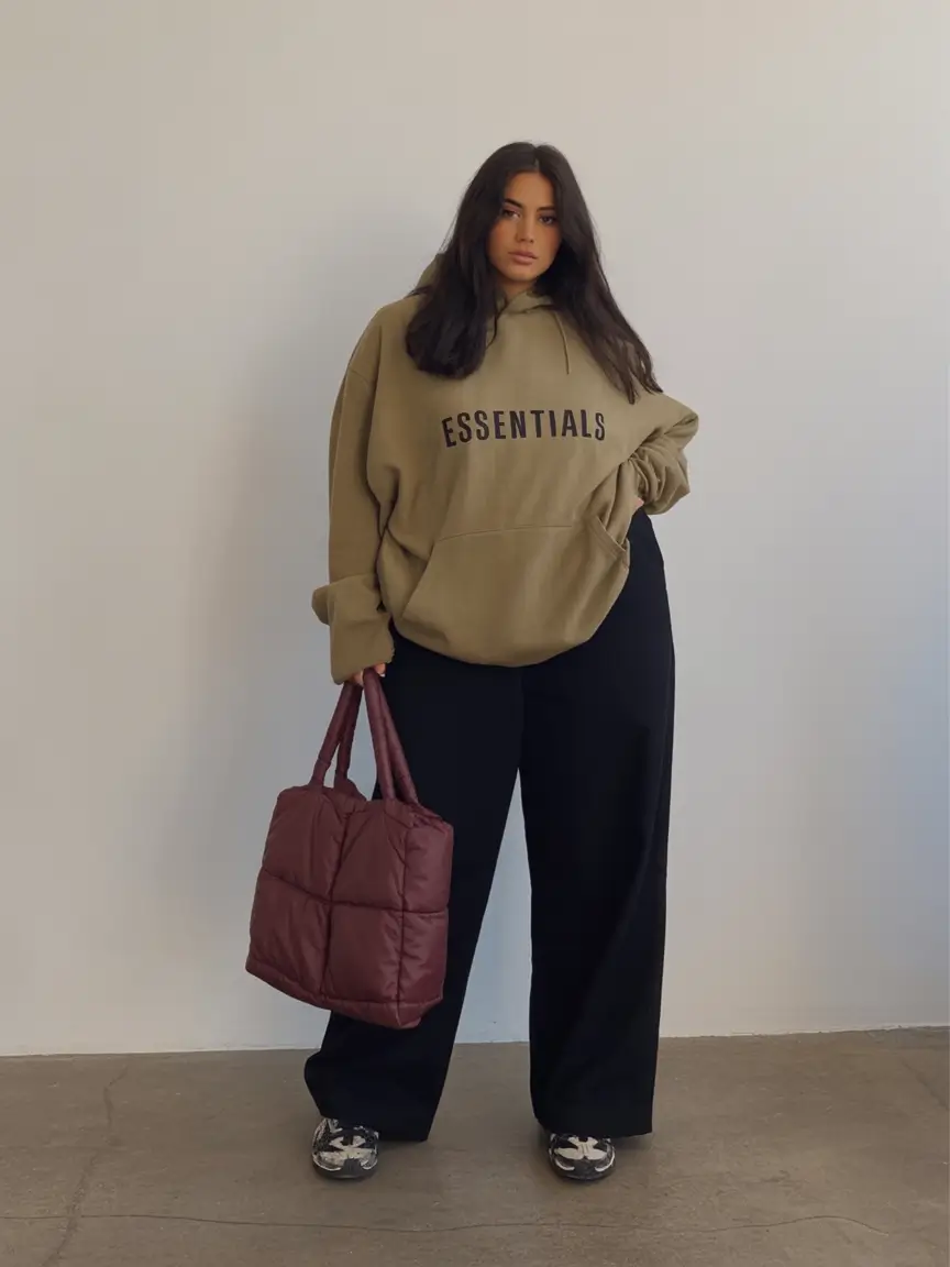 There are days when one needs to be comfortable, yet stylish. A large khaki hoodie and loose black jeans combine that curvy outfits casuales feel with the deliberateness of the actual streetwear. It has a slouch that is the best kind, it is grounded, calm and cool. The oversized tote is practical, yet the brand remains faithful to the neutral, minimalistic color scheme characteristic of 2026 curvy clothes as well as size trends.